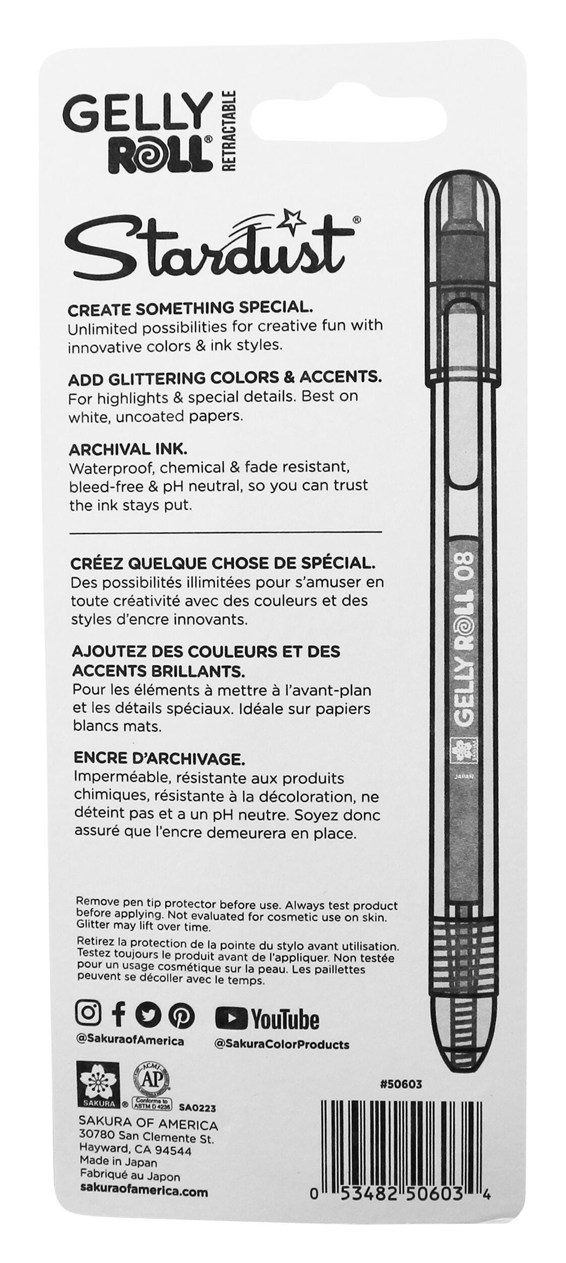 Stunning Gelly Roll Stardust captures the sparkle and glitter of stars to create unique effects in your art or handwriting. Use it for highlight or special details. For the best results, use stardust gel ink on light colored or matte paper surfaces.