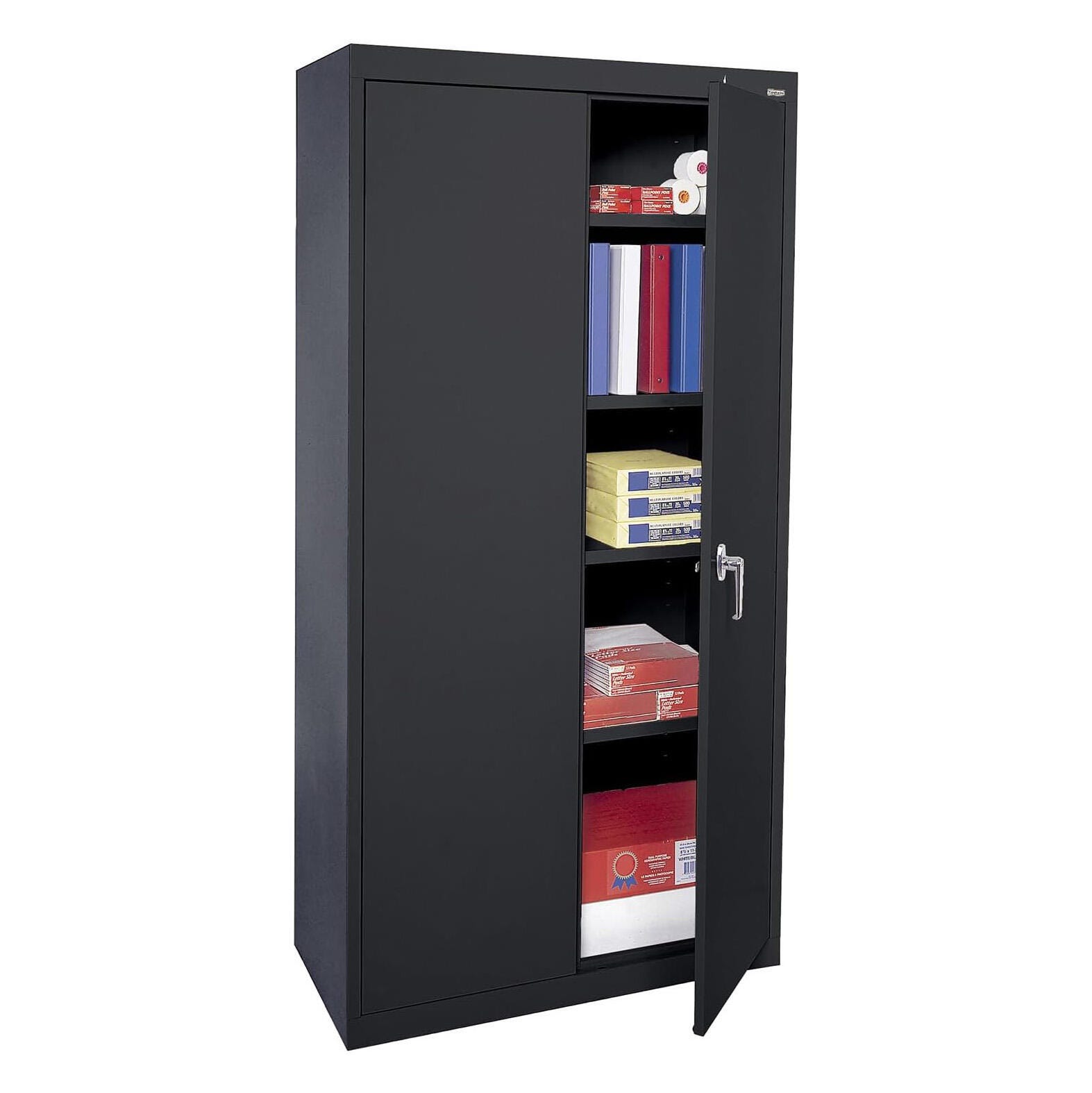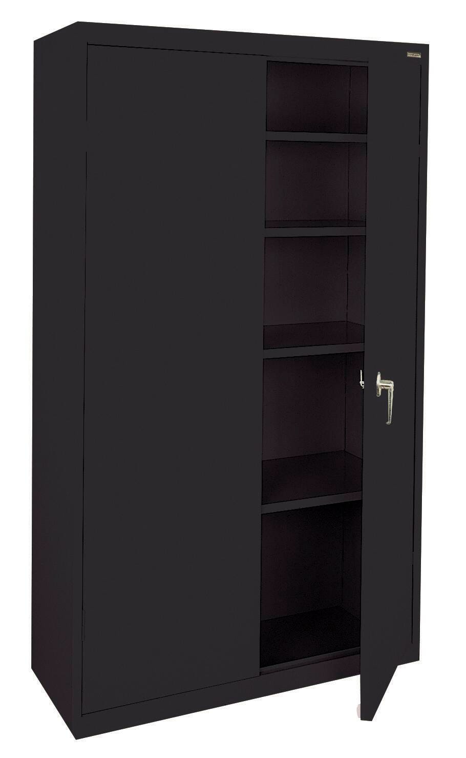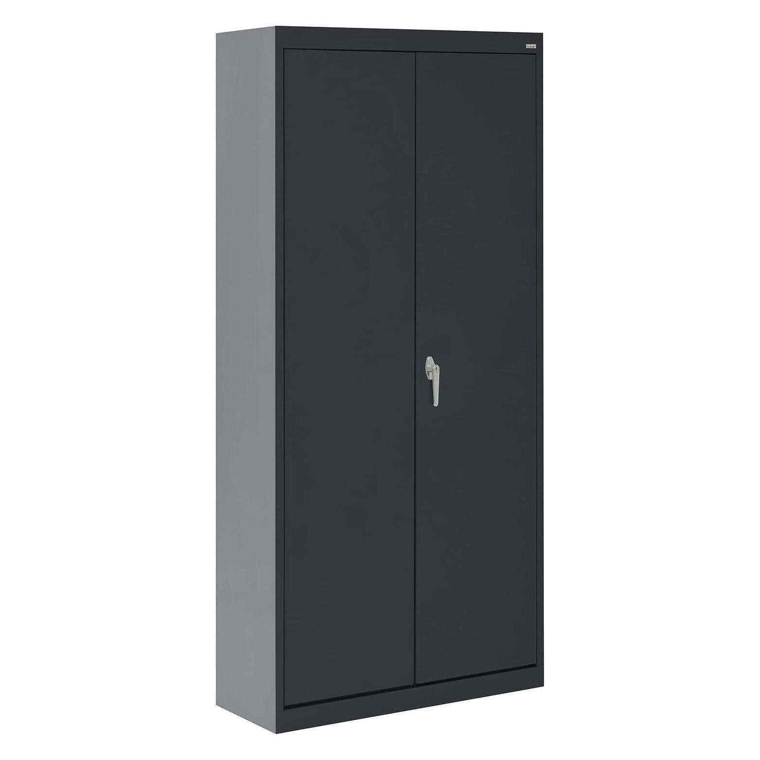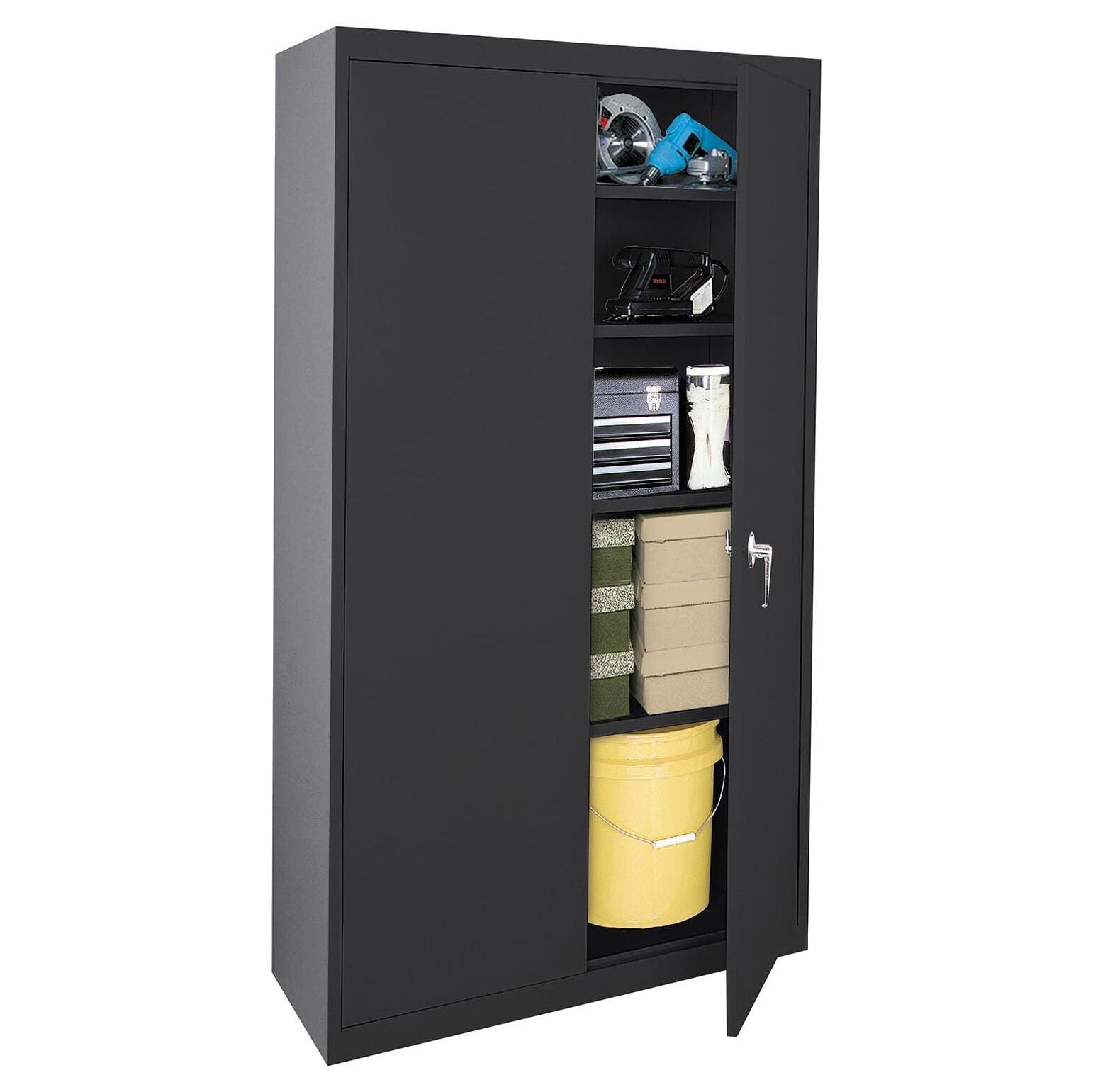 Cabinet features cam locking handle, welded steel construction and a powder coat finish. Handle requires assembly. Meets ANSI/BIFMA shelf standards. There are 5 fixed shelves, the base is counted as a shelf. Measures 36 W x 18 D x 72 H inches. GreenGuard Gold certified.