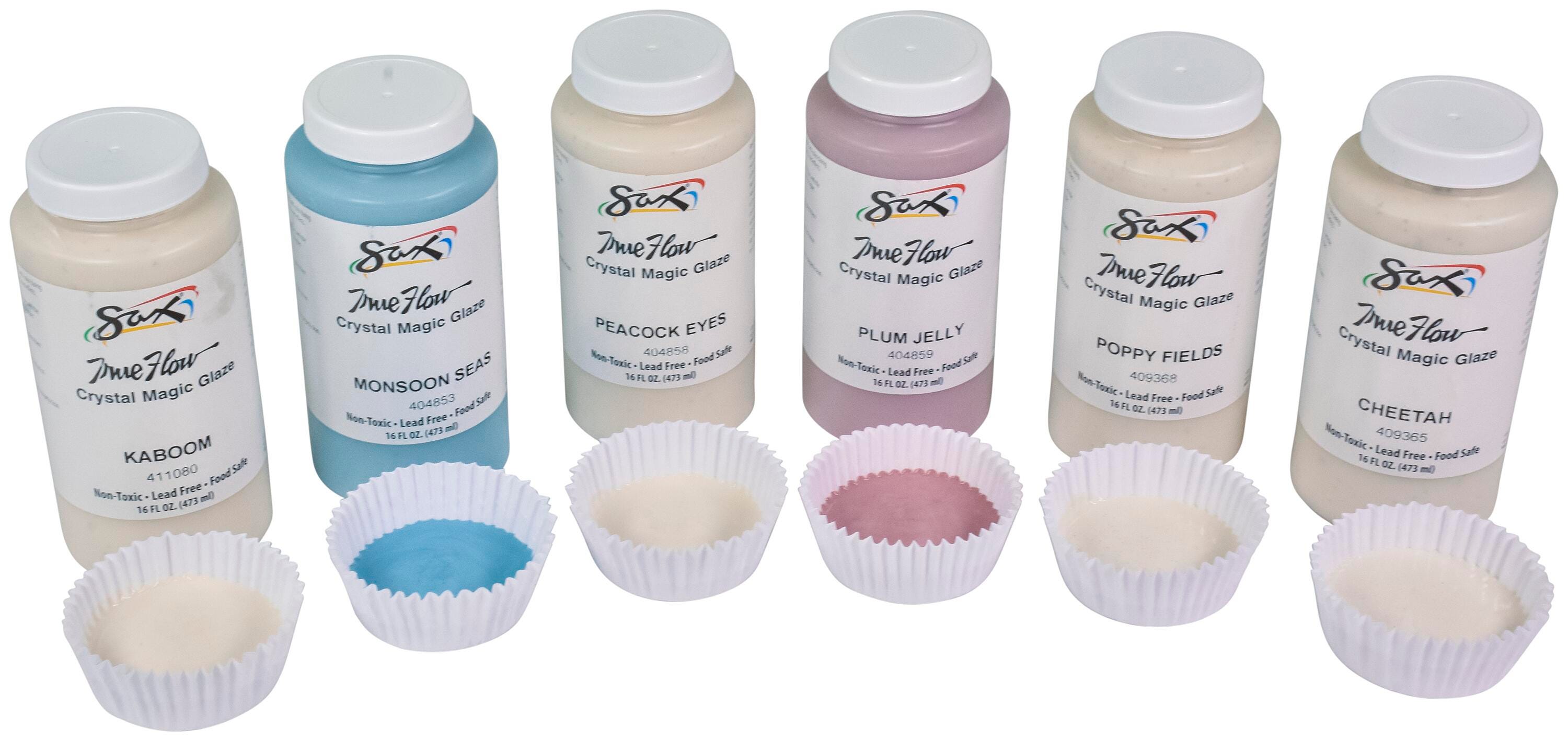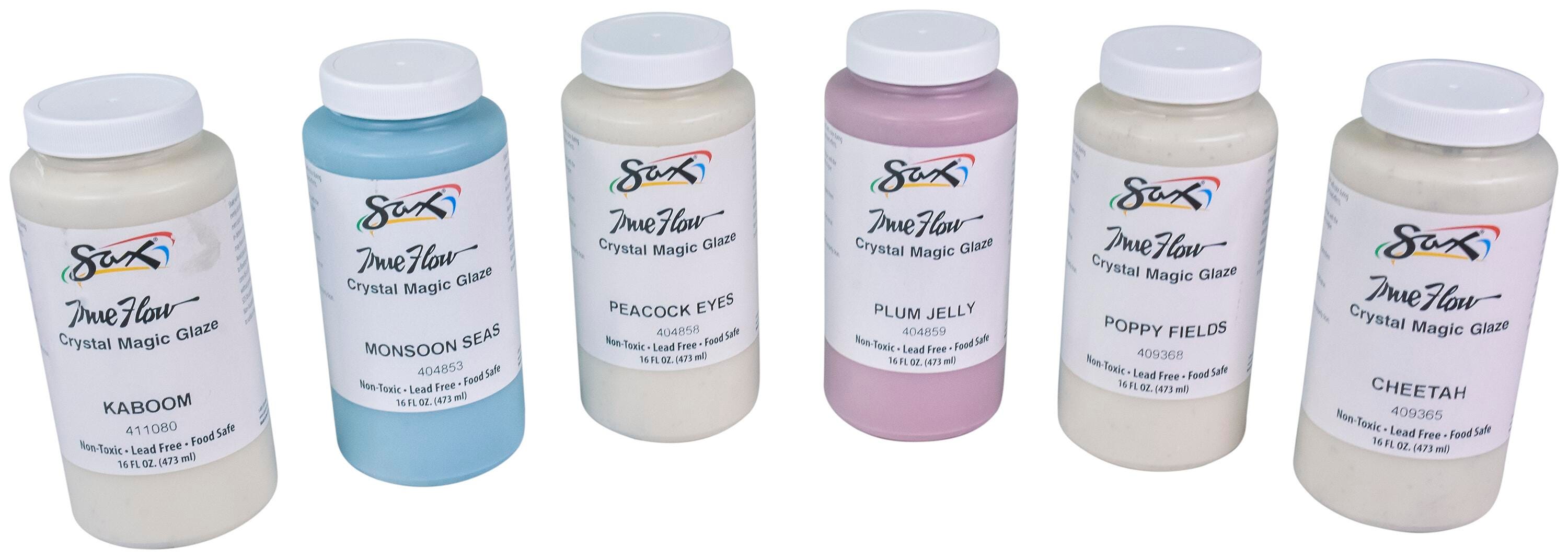 Sax Crystal Magic Glazes feature tiny crystals mixed with a speckled base, which melt and move during firing, allowing colors to bloom for beautiful, one-of-a-kind designs. Every application and firing will produce different results for unique pottery and ceramic projects. The painting glaze may appear a different color during application and change to the desired look after the required firing in a kiln. Our pottery covering creates multi-colored patterns when fired. Please see individual colors for firing results when fired at cone 6. This set of 6 contains 1 pint jars of each of the following designs: Monsoon Seas (Semi-Opaque), Peacock Eyes (Semi-Opaque), Plum Jelly (Opaque), Kaboom (Semi-Opaque), Poppy Fields (Semi-Opaque), and Cheetah (Semi-Opaque).Features