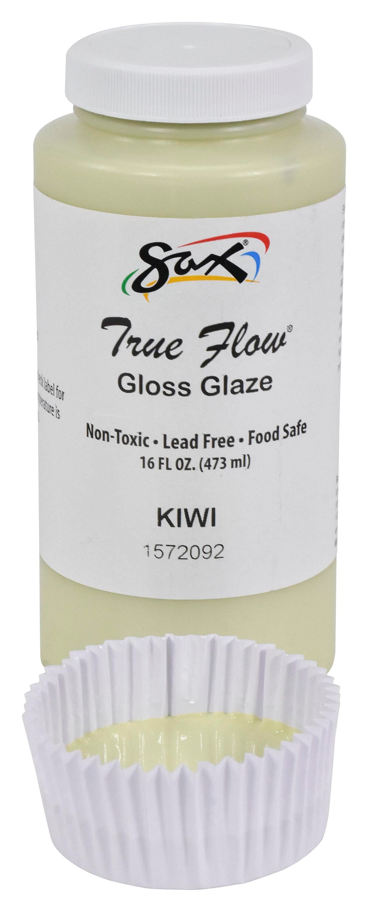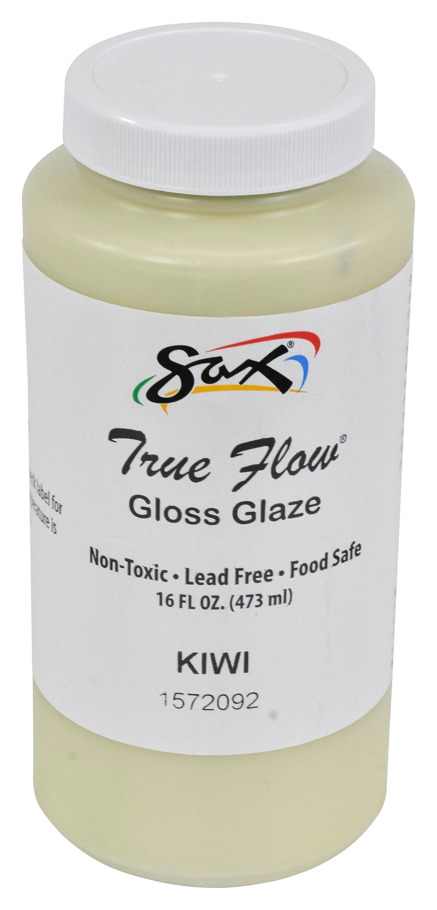 The Sax gloss glaze in opaque Kiwi is a high-quality glazing paint that's dinnerware safe when fired to cone 06-05. During application, the glaze may be a different color and will change to the desired look after the required kiln firing. The color does not change when fired at cone 6.