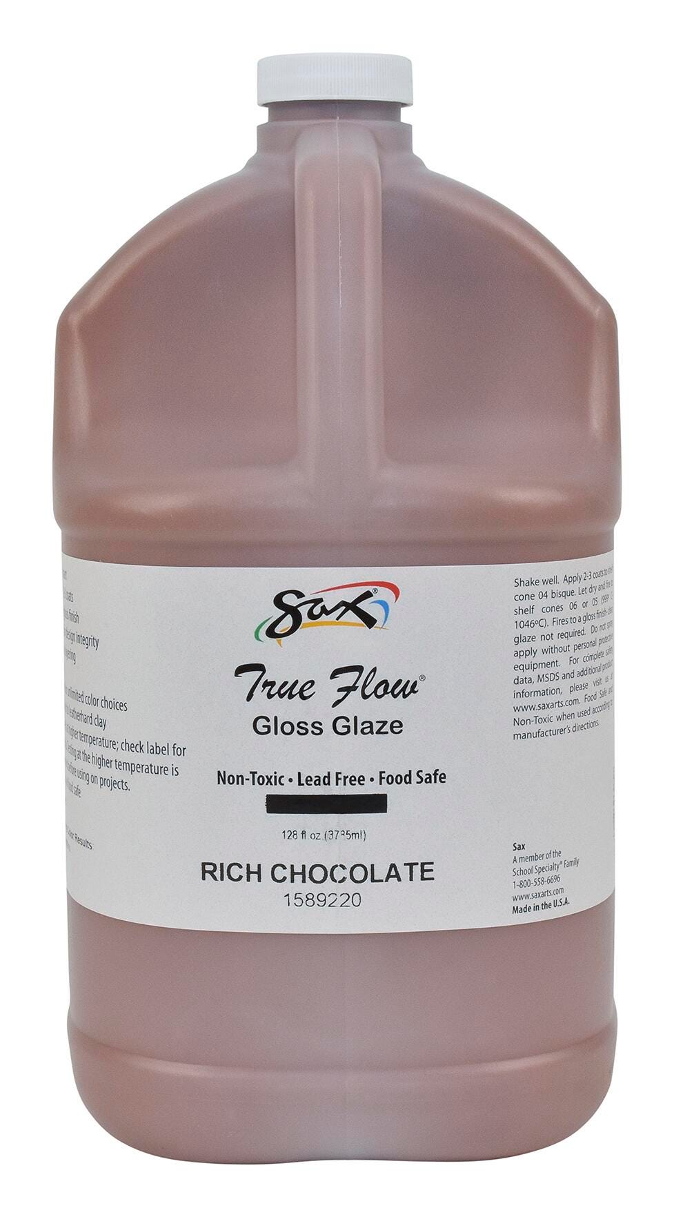 The Sax gloss glaze in opaque Rich Chocolate is a high-quality glazing paint that's dinnerware safe when fired to cone 06-05. During application, the glaze may be a different color and will change to the desired look after the required kiln firing. The color lightens when fired at cone 6.