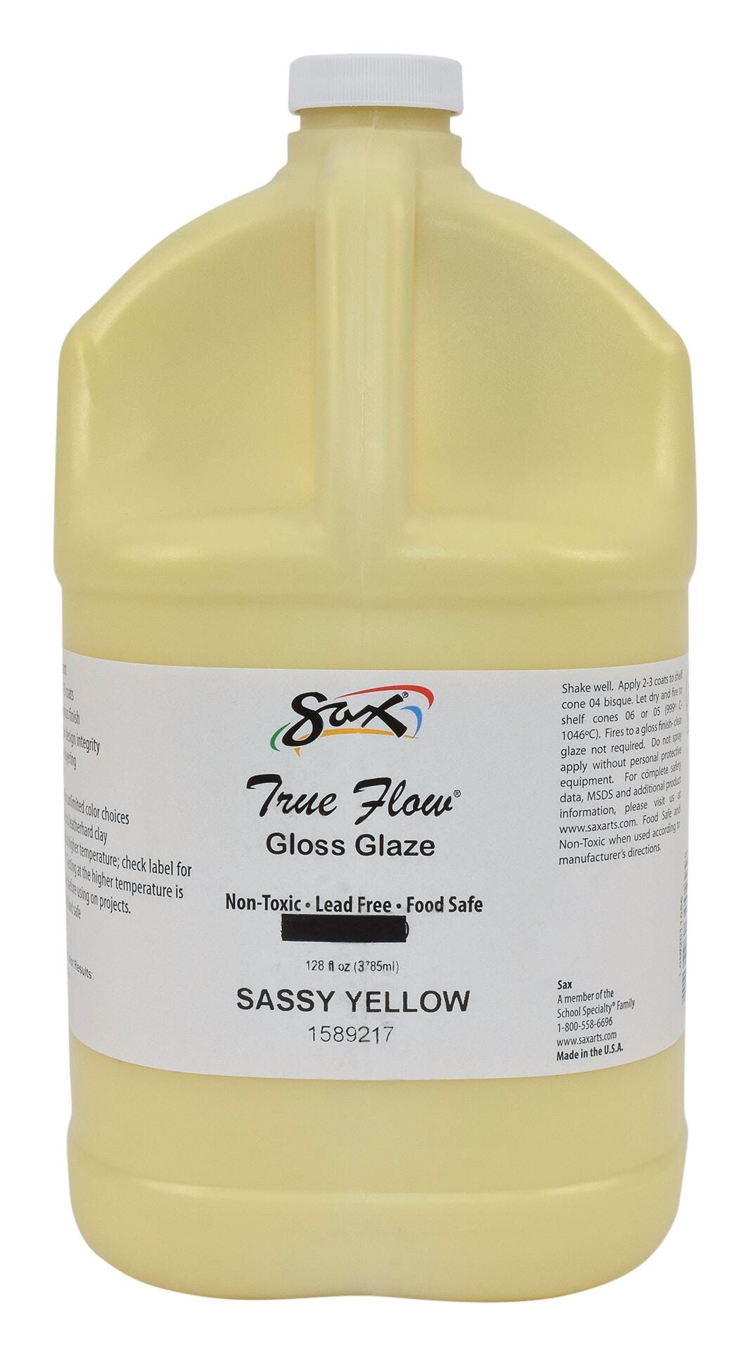 The Sax gloss glaze in opaque Sassy Yellow is a high-quality glazing paint that's non-toxic and dinnerware safe when fired to cone 06-05. During application, the glaze may be a different color and will change to the desired look after the required kiln firing. The color lightens when fired at cone 6.
