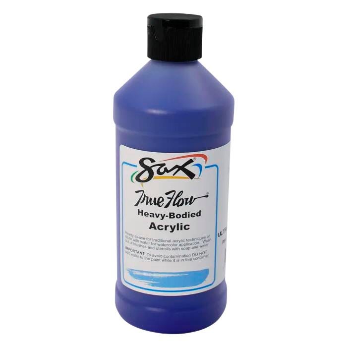 This Sax heavy body acrylic paint in a ultramarine blue color comes in a convenient 1 pint bottle to accommodate the classroom. Non-separating and intermixable for a range of hues, our art paint is easy to apply. This paint dries to a matte finish and is ideal for traditional acrylic painting as well as block printing or silk screening. Enjoy excellent flow, coverage, blending, and drying for a variety of projects. Use the classroom paint for school assignments, art classes, group painting, or background canvas painting. Each acrylic paint comes in a durable plastic container for convenient handling and storage. Not recommended for outdoor use.