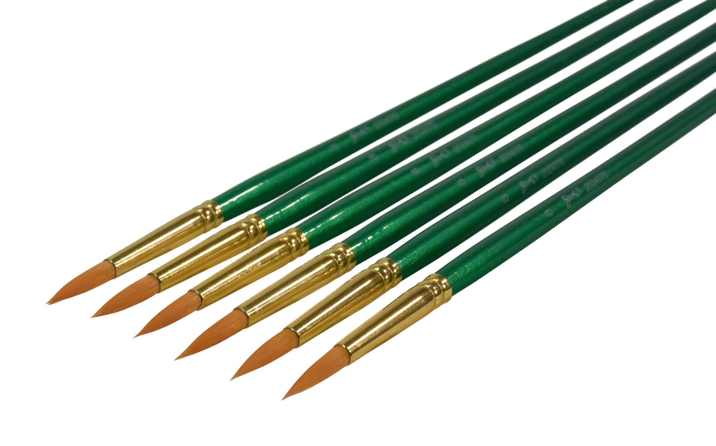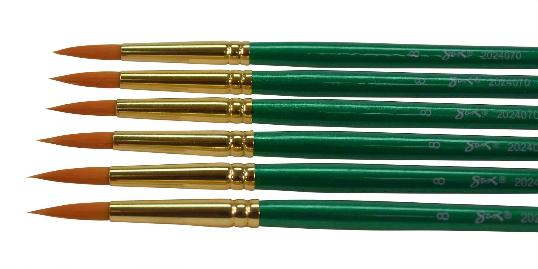 Sax golden taklon paint brushes with long handles and a round tip provide optimum snap and smooth application. Excellent brush strokes help students create their best projects while enhancing their painting techniques on different media. Our 6-pack of synthetic bristle brushes is perfect for all your crafting needs in the classroom or art studio. Use the size 8 brushes for fine detail and small spaces. Golden nylon synthetic hair brushes are great with different mediums, including oil, acrylic, and watercolors.Features