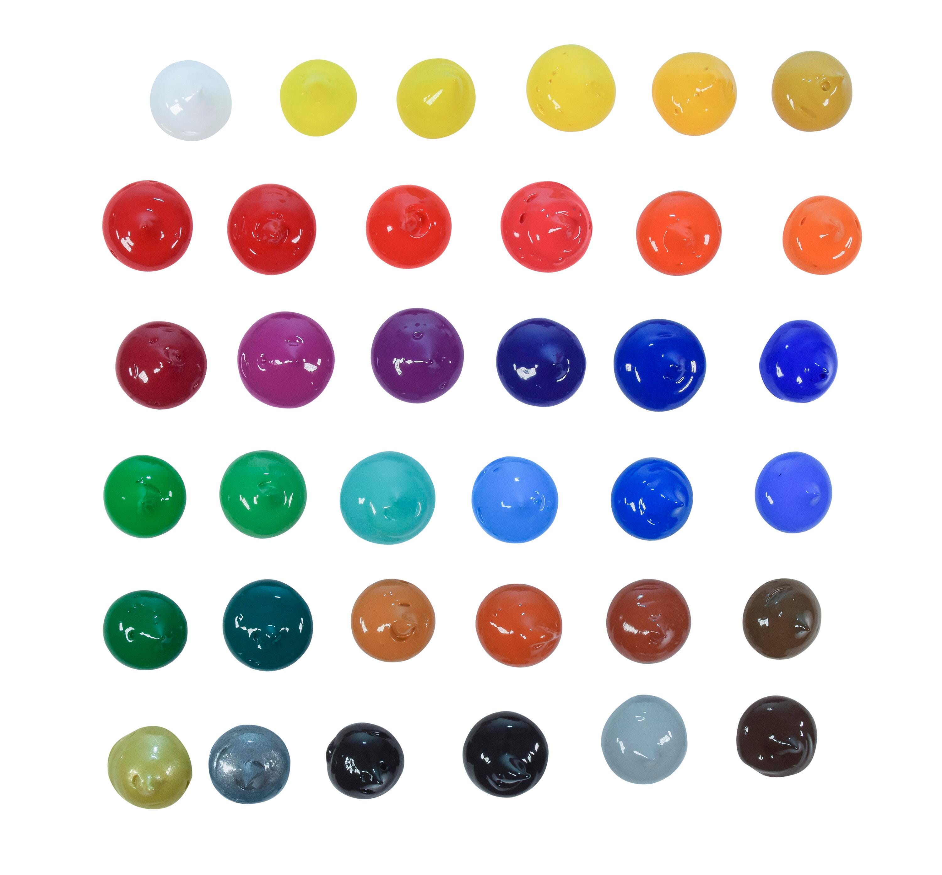 Includes 36 Paints, 1 of Each Color: Cerulean Blue Hue, Cobalt Blue Hue, Alizarin Crimson Hue, Primary Red, Cadmium Orange Hue, Burnt Sienna, Burnt Umber, Primary Yellow, Permanent Green, Phthalo Green, Primary Blue, Dioxazine Purple, Ivory Black, Titanium White, Cadmium Red Light Hue, Cadmium Yellow Medium Hue, Pthalo Blue, Deep Magenta, Raw Sienna, Raw Umber, Red Oxide, Ultramarine Blue, Yellow Oxide, Bright Aqua Green, Cadmium Red Deep Hue, Cadmium Red Medium Hue, Cadmium Yellow Deep Hue, Cadmium Yellow Light Hue, Permanent Green Deep, Deep Violet, Gold, Neutral Gray, Silver, Napthol Crimson, Mars Black, Hookers Green Hue