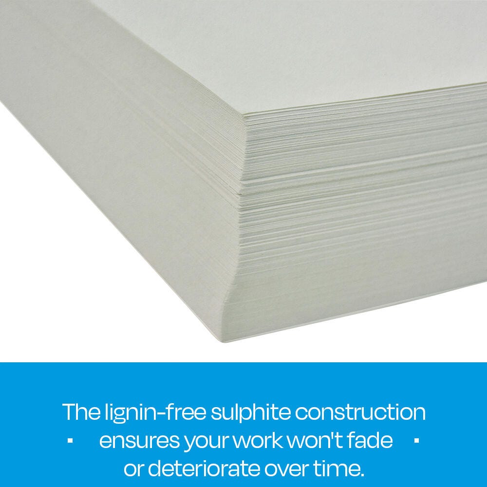 This high-quality, 100 percent sulphite paper from Sax is standard weight and accepts dry media and wet media, including tempera, watercolor, and brushed-applied ink. The paper has exceptional body and strength, perfect texture for all dry media renderings, and erases well. The brilliant white stock enhances colored pencil, heavy black pencil, and charcoal drawings.