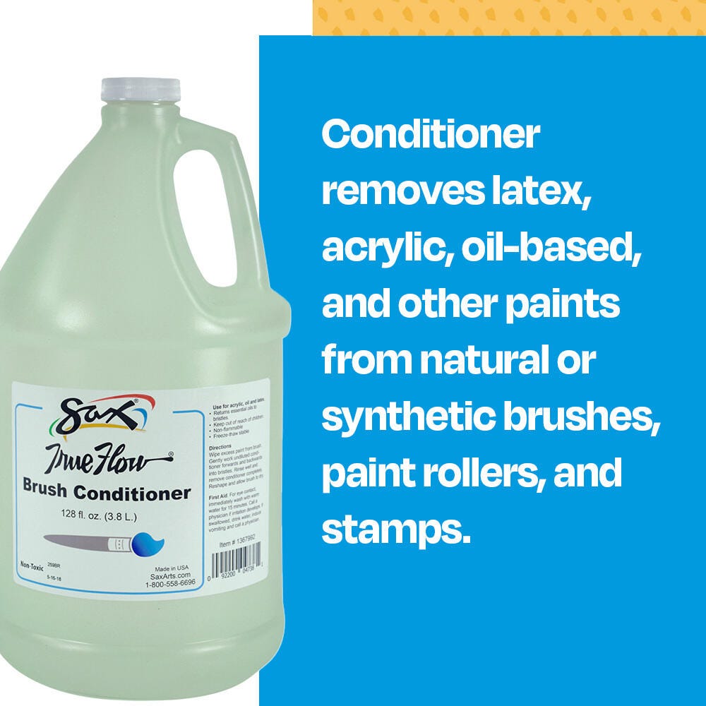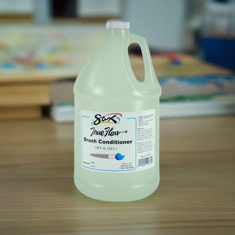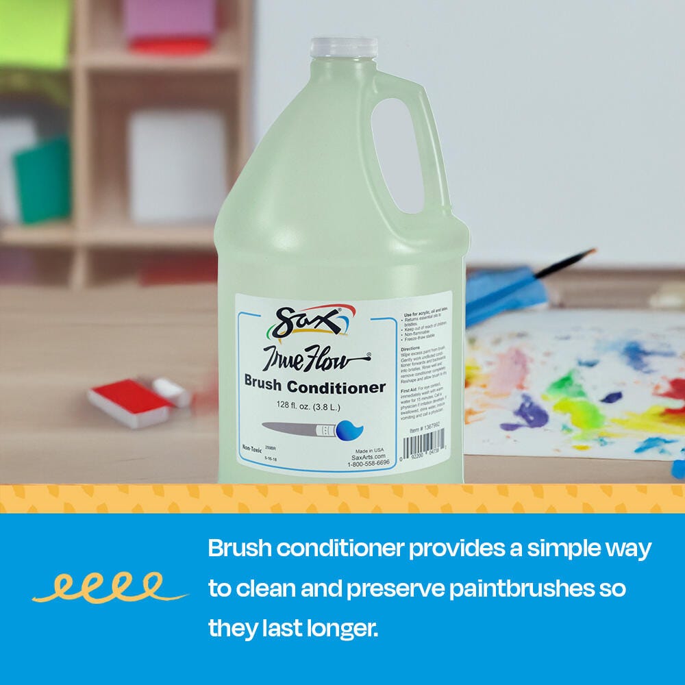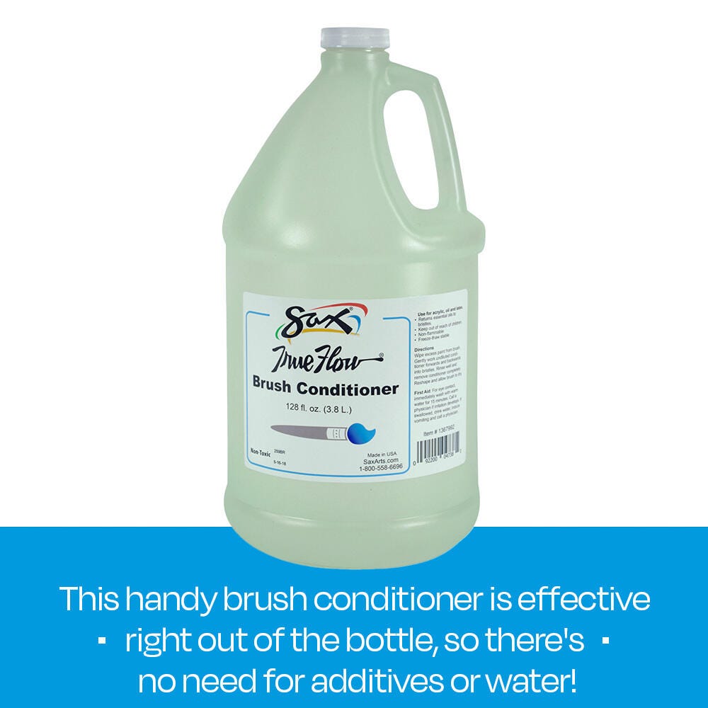 Extend the life and body of your precious paint brushes with Sax True Flow Brush Conditioner. Just like hair care, this brush soap naturally scrubs, cleans, and preserves brushes by returning essential oils to the bristles. Simply pour it into a container and dip the brush into the solution—no diluting or water necessary! Soak and reshape the bristles by hand, or allow the dried paint or acrylic to soak in conditioner until loosened. This brush conditioner comes in a sturdy 1-gallon container. Keep out of reach of children. Nontoxic.