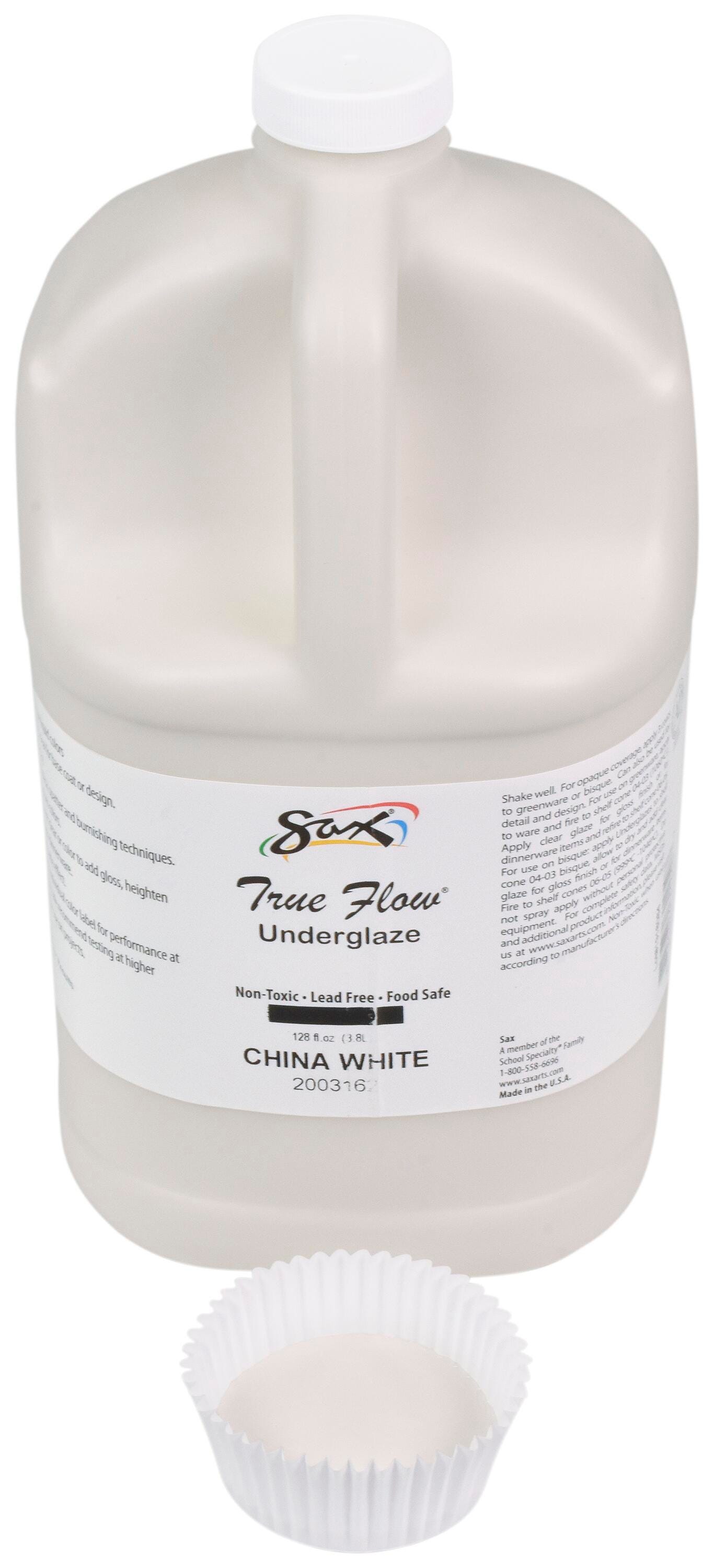 Sax China White underglaze paint comes in a concentrated opaque liquid color. Decorate pottery with this glazing paint that's ready for use on clay, greenware, and bisque. The color may be a different shade during application and will change to the desired look after the required kiln firing. This painting medium's color does not change when fired at cone 6. Our high-quality underglaze has a matte look after firing and can be transformed to a shiny, rich glaze appearance with a transparent glaze coating on top.Features