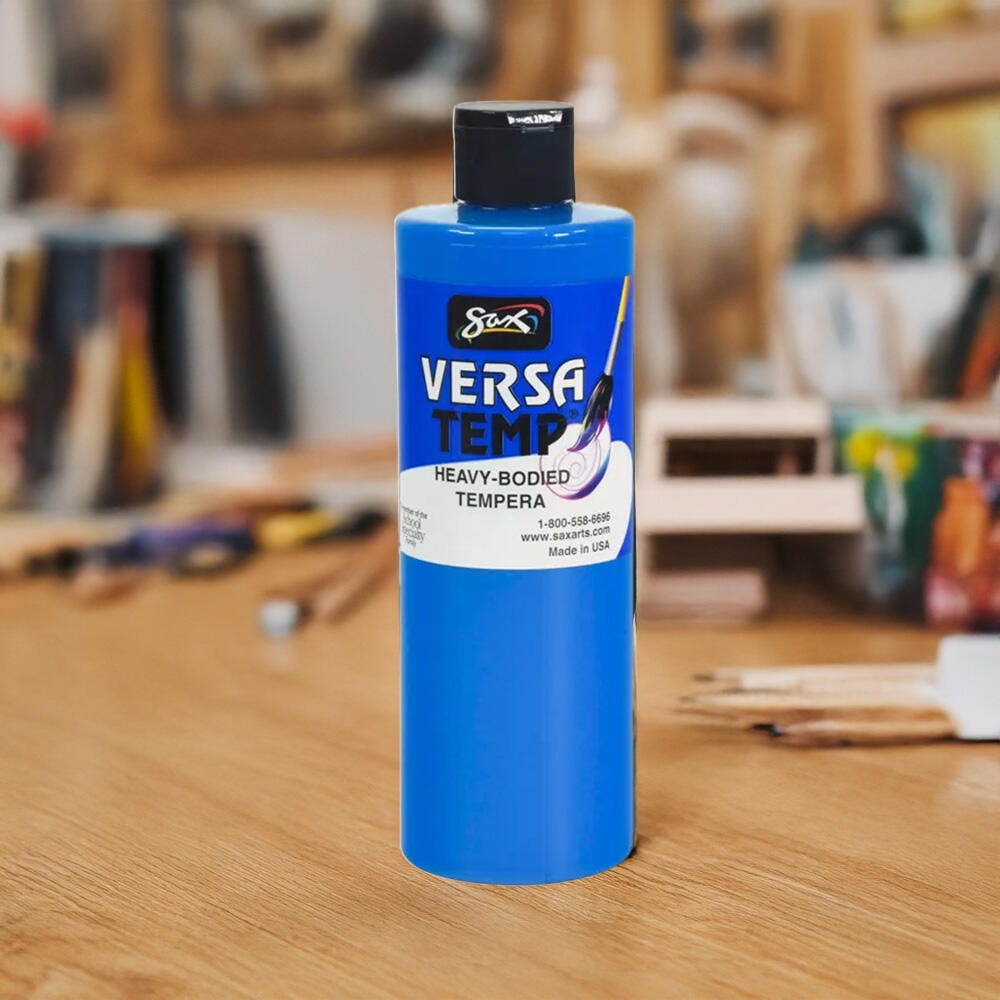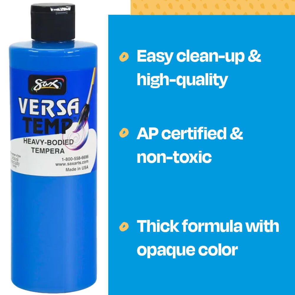 Sax Versatemp heavy-bodied tempera paint in fluorescent blue produces bold, vibrant results. Foster creativity with a paint that resists cracking and chipping. The convenient pint bottle is easy to pour and store, and is perfect for sharing in the classroom. Complete art projects, posters, and signs that stand out with one shade or craft new hues by mixing. The heavy formula is easy to apply and mix.