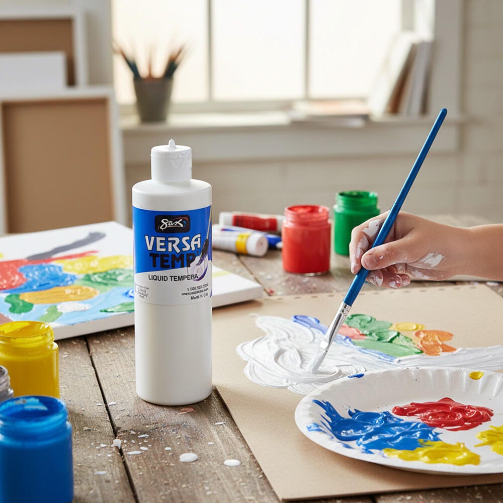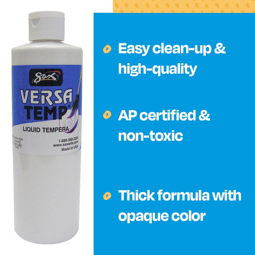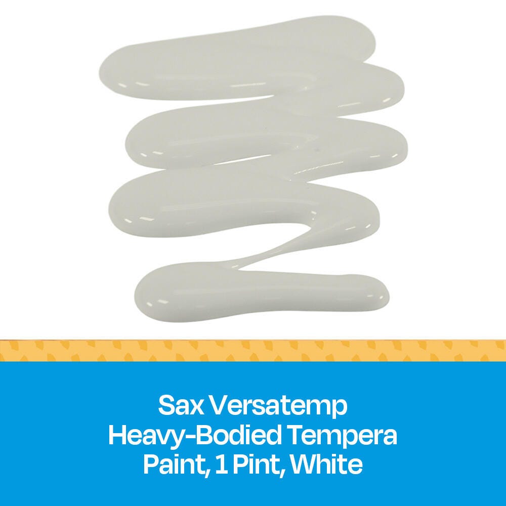 Sax Versatemp heavy-bodied tempera paint in white produces bold, vibrant results. Foster creativity with a paint that resists cracking and chipping. The convenient pint bottle is easy to pour and store, and is perfect for sharing in the classroom. Complete art projects, posters, and signs that stand out with one shade or craft new hues by mixing. The heavy formula is easy to apply and mix.