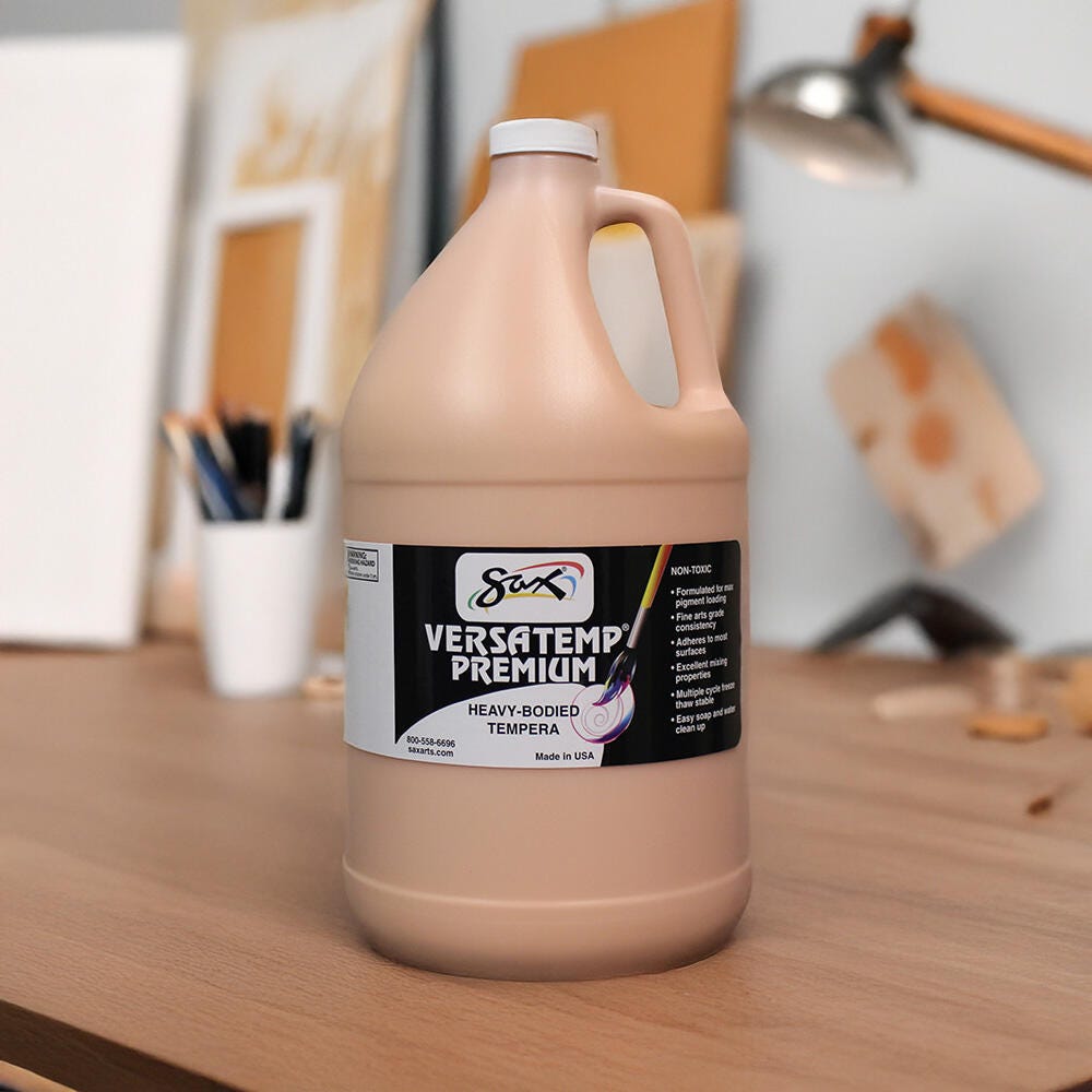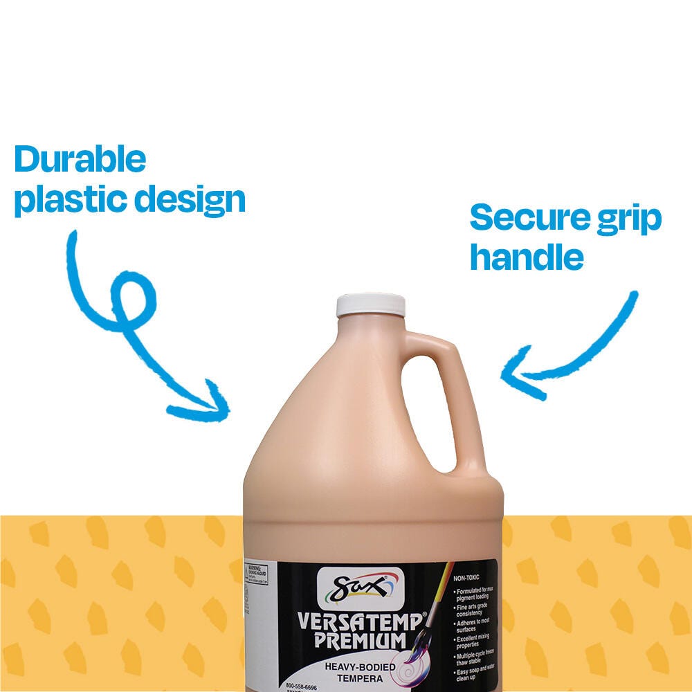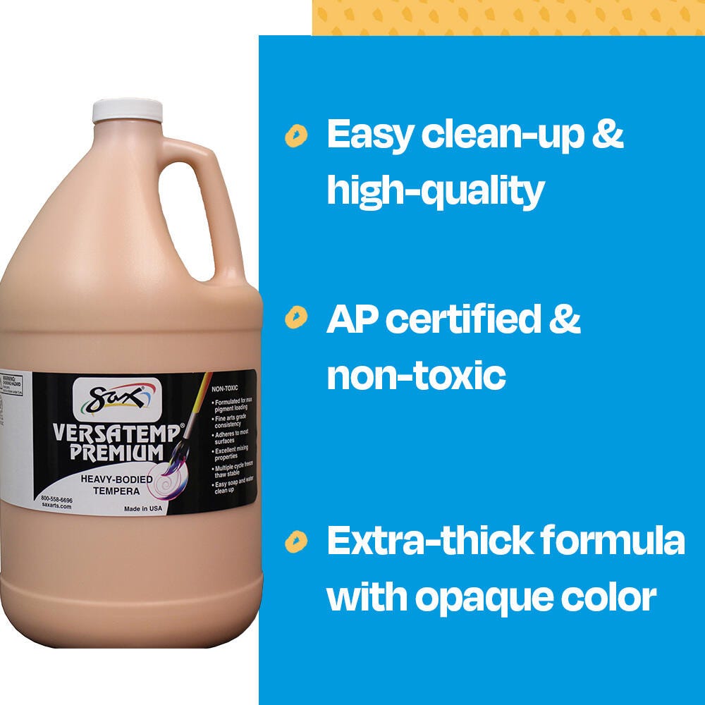 Sax Versatemp premium heavy-bodied tempera paint in peach is perfect for artists and students. Enjoy richer, brighter, and more intense colors with a thick consistency that provides superior brush film build and excellent color mixing properties. This tempera is perfect for block and screen printing as well as signs, sets, and backdrops. Complete projects, posters, and unique paintings with this high-quality painting medium in a large 1 gallon bottle. Stock up and save with our tempera paints.