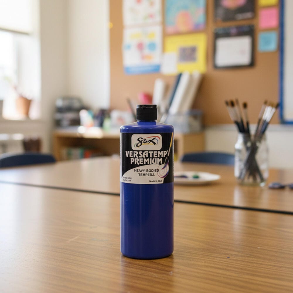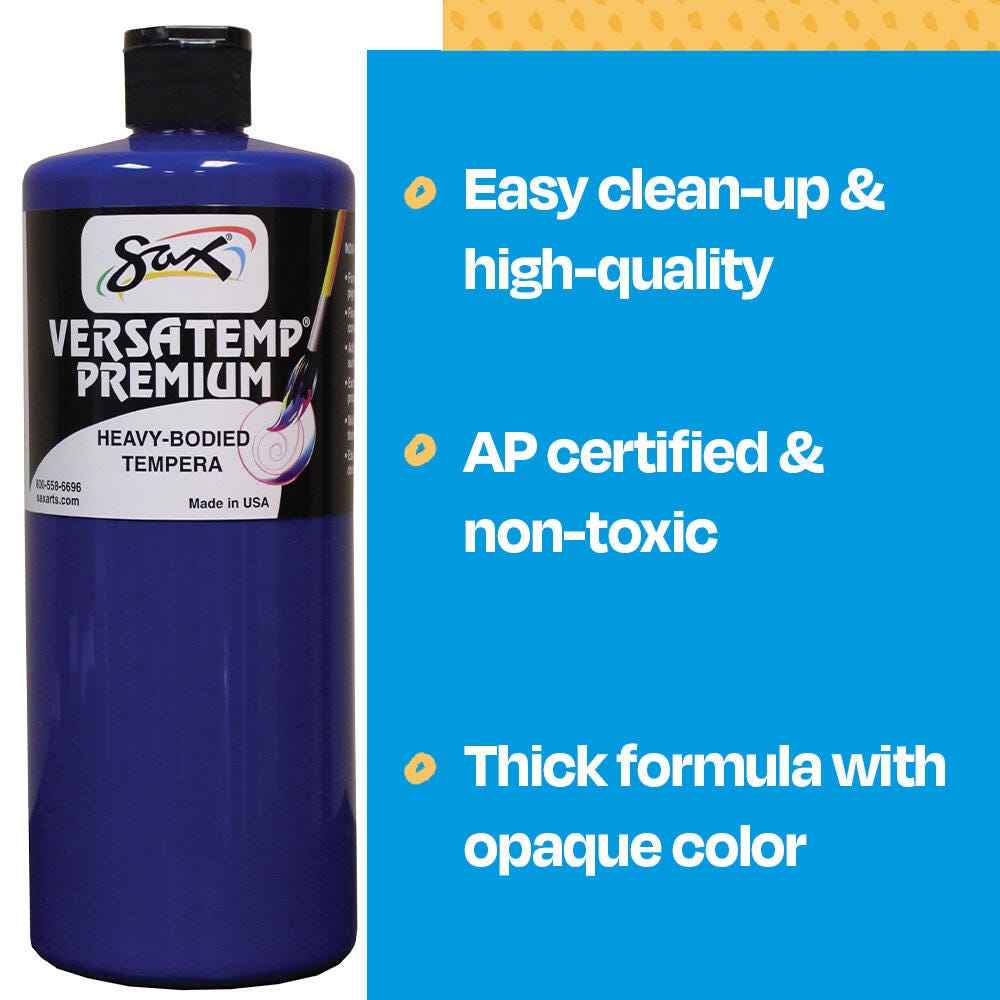 Sax Versatemp premium heavy-bodied tempera paint in primary blue is perfect for artists and students. Enjoy richer, brighter, and more intense colors with a thick consistency that provides superior brush film build and excellent color mixing properties. This tempera is perfect for block and screen printing as well as signs, sets, and backdrops. Complete projects, posters, and unique paintings with this high-quality painting medium in a convenient 1 quart bottle. Stock up and save with our tempera paints.