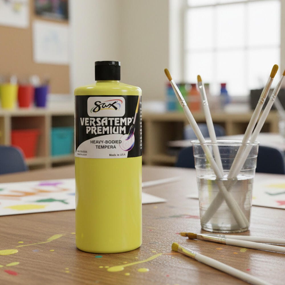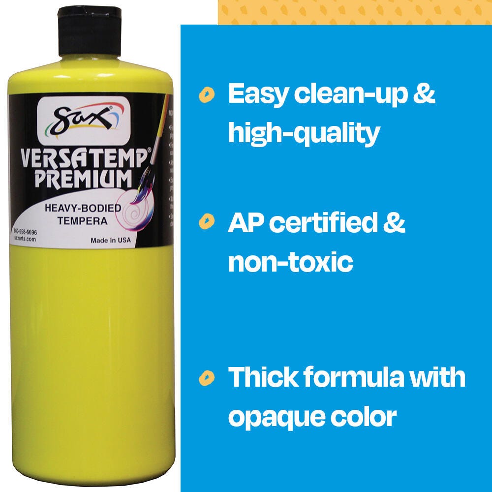 Sax Versatemp premium heavy-bodied tempera paint in yellow is perfect for artists and students. Enjoy richer, brighter, and more intense colors with a thick consistency that provides superior brush film build and excellent color mixing properties. This tempera is perfect for block and screen printing as well as signs, sets, and backdrops. Complete projects, posters, and unique paintings with this high-quality painting medium in a convenient 1 quart bottle. Stock up and save with our tempera paints.