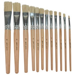 These wooden-handled paint brushes include assorted sizes in flat tips for artists of all levels.