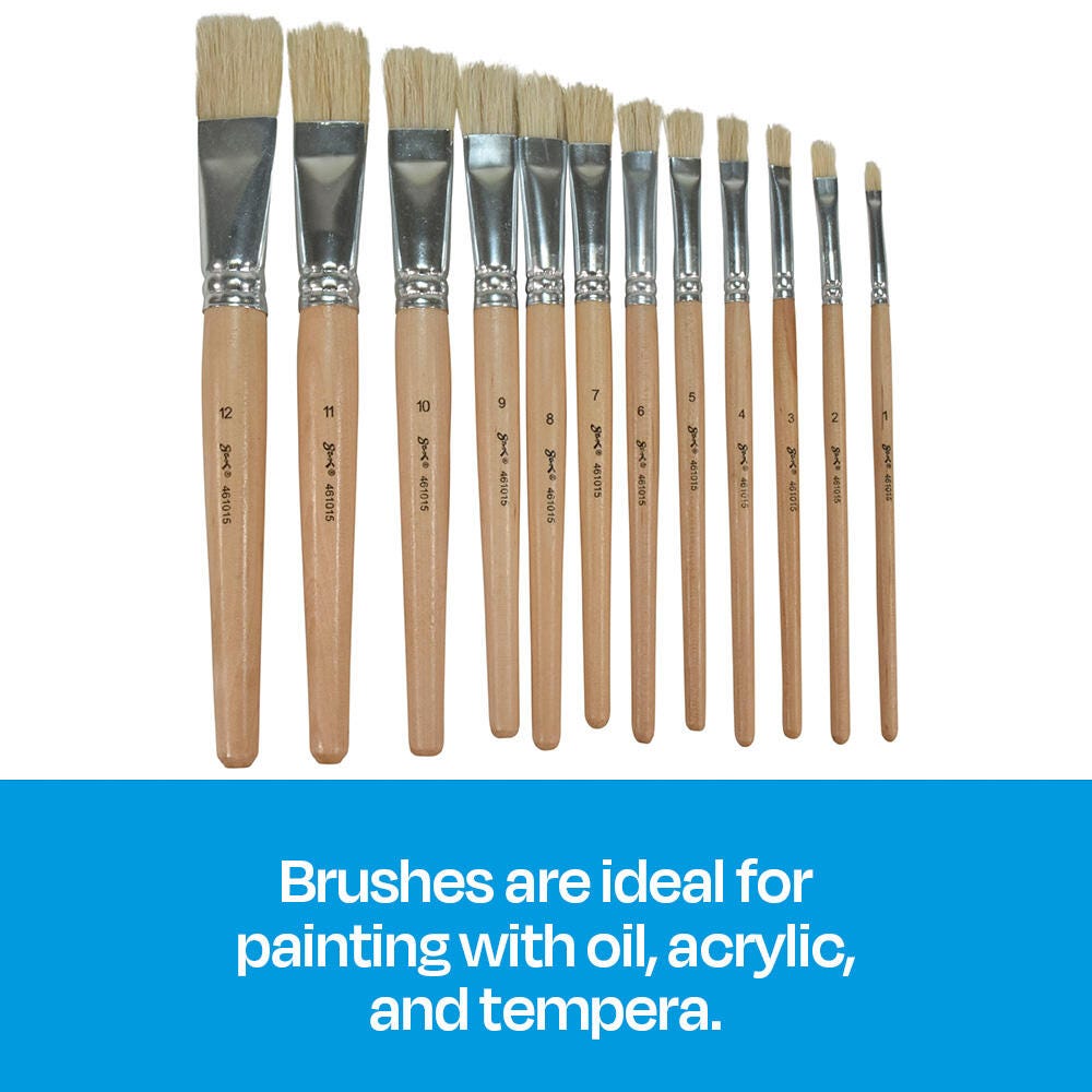 Sax white bristle paint brushes with flat tips provide superb color holding, spring, and smooth application. The white bristles are strong yet springy to hold a large amount of paint with each dip, and the silver-toned ferrules are seamless and made of aluminum. Our flat brushes also work well for smooth and even-colored coverage. The short handles give the painter more control while painting and the hardwood handles have a clear coat finish for extra durability. Our 144-pack of assorted sized brushes comes in a durable plastic bucket and bulk count that’s perfect for use in classrooms, studios, and beyond. Use the flat brushes with oil, acrylic, and watercolors. With a total of 144 brushes, this set delivers 12 art brushes in each size: 1 to 12 (sizes range from 3/16 to 7/8 inch width).Features