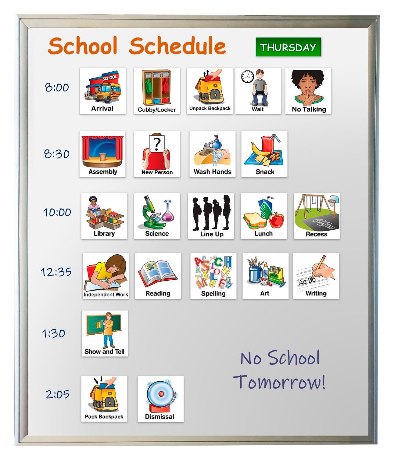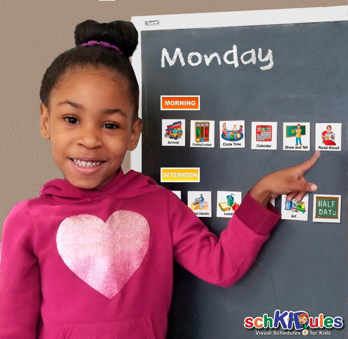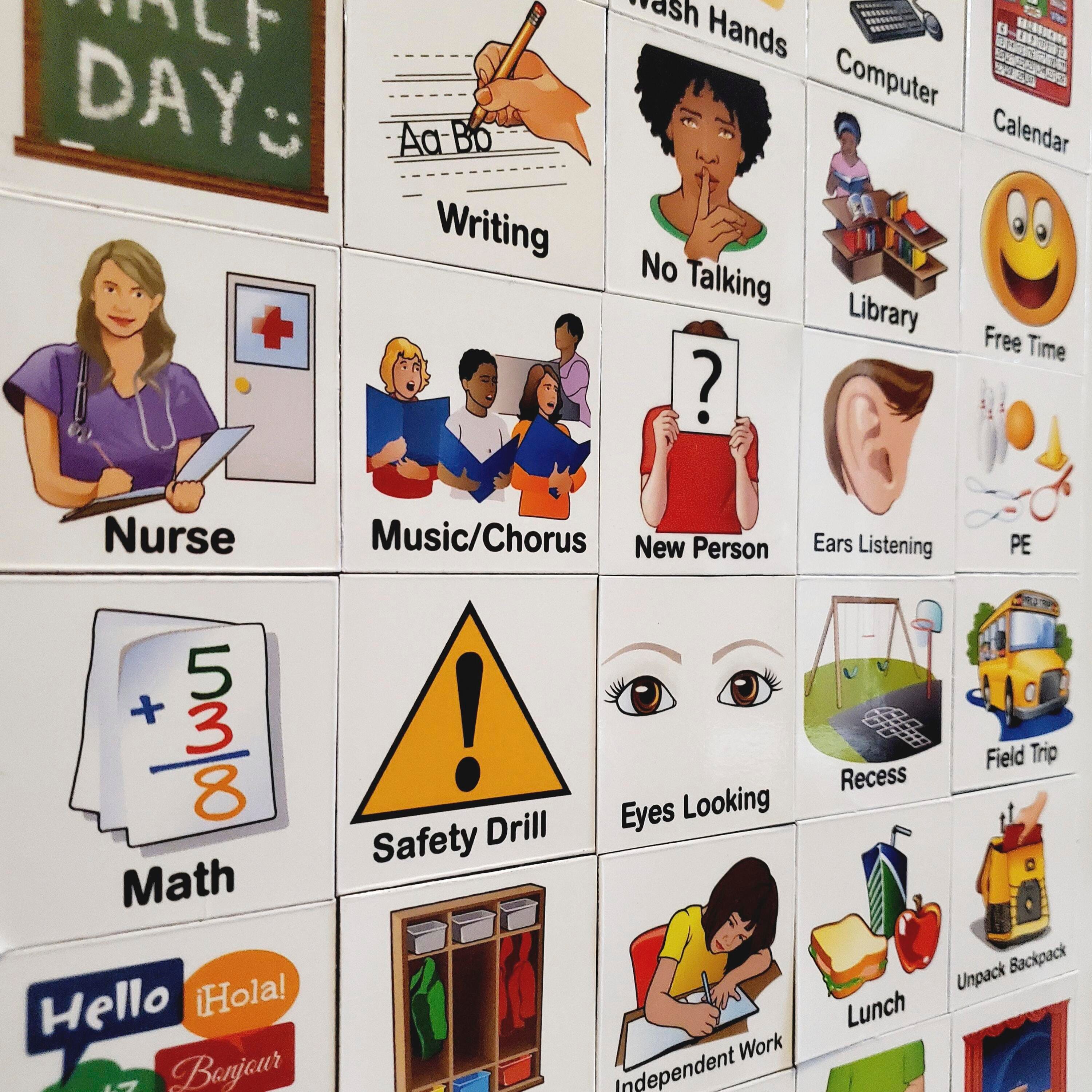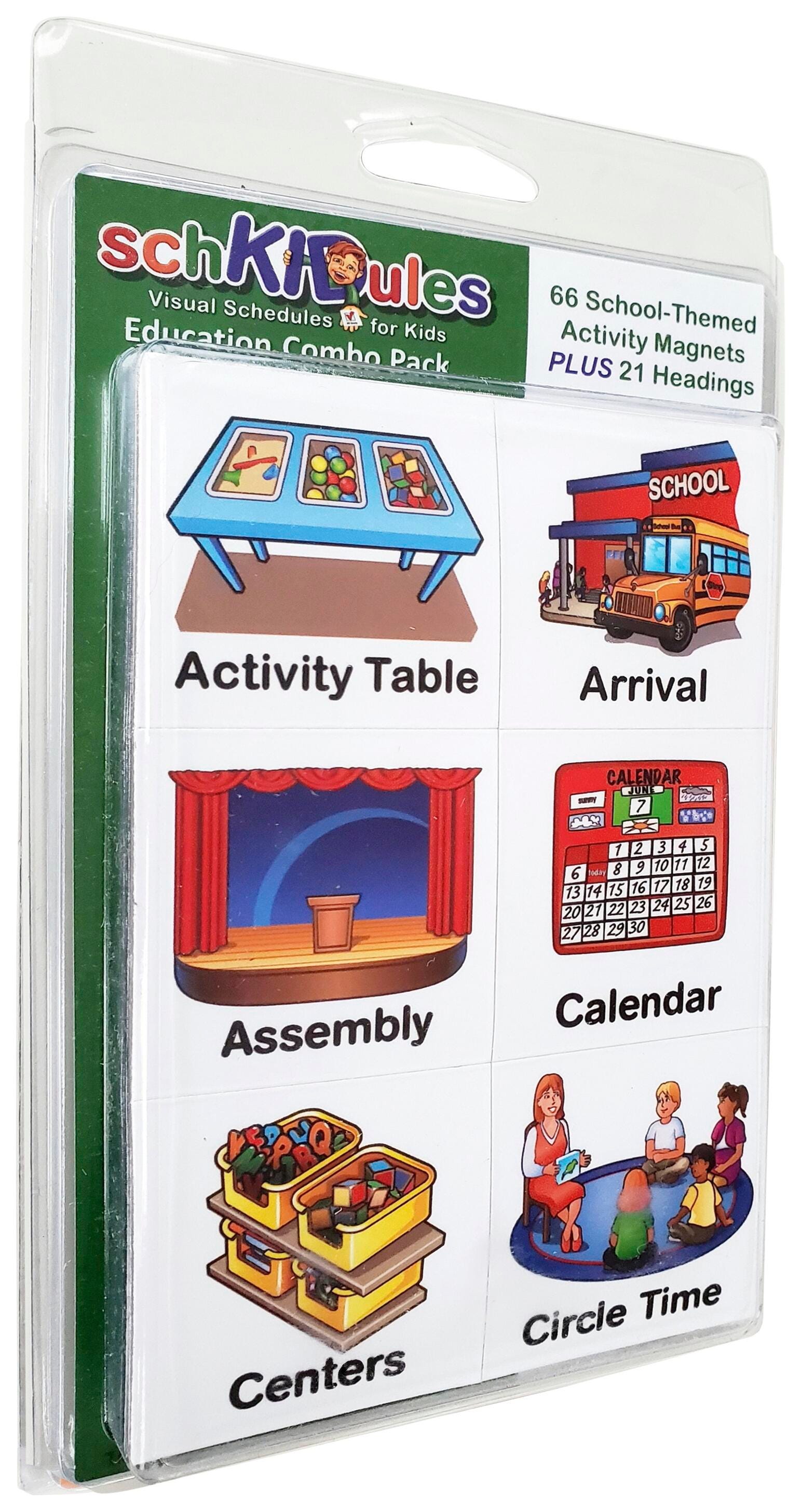 SchKIDules Education Collection Combo Pack includes 66 school related activity magnets PLUS our 21 piece headings sheet for easy customization and set up. It’s made available to support the easy creation of a visual schedule for a student or small group. Simply use them on any magnetically receptive surface to communicate the day’s schedule to a child. Visual schedules are helpful behavioral supports that assist teachers and parents communicate expectations, what's next and schedules to children. Each activity magnet is 2 × 2 inches, laminated with a dry erase friendly finish and 30 mil quality thickness.