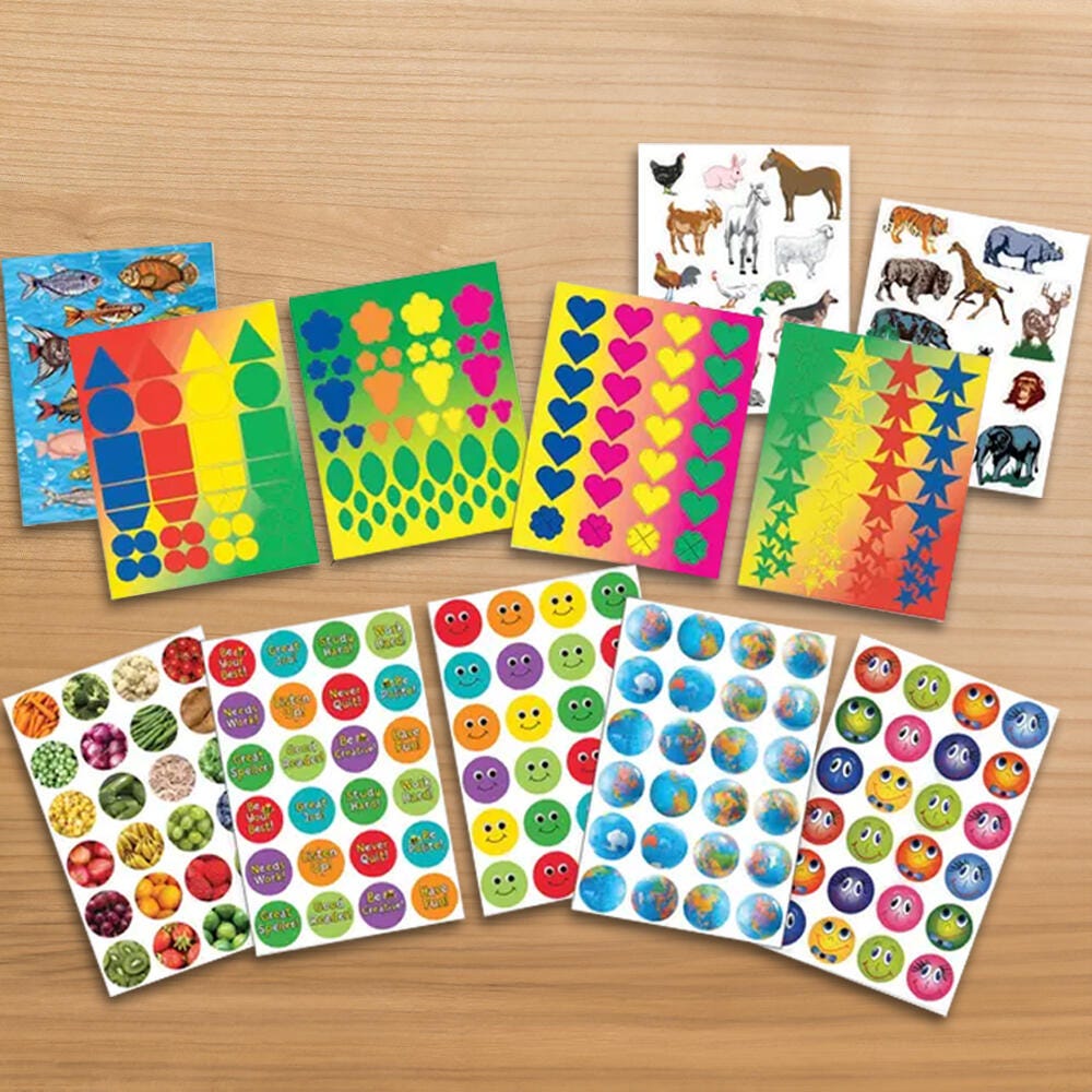Use the School Smart sticker set for teachers for everyday fun in the classroom or special occasions and rewards. The sticker assortment features a wide variety of stickers that are educational, motivational, and most importantly fun. This teacher stickers set has 5 sheets each of the following: fruits/veggies, be your best, smiley face, globes, funny faces, fish, farm animals, wild animals, basic shapes, floral shapes, heart shapes, and star shapes.Features