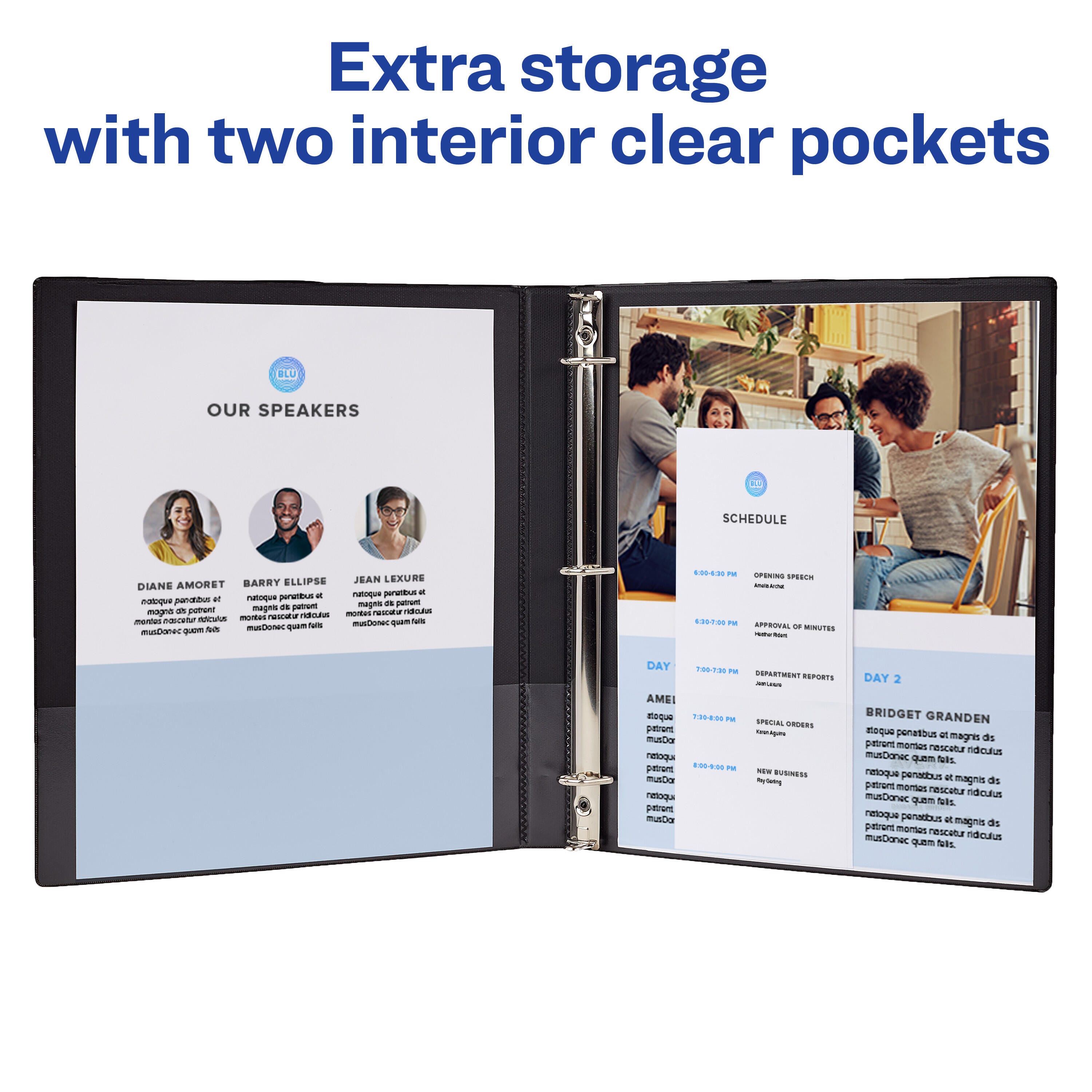 Avery Durable View Slant Ring Binders feature durable construction that is ideal for frequent referencing. DuraHinge design is stronger, lasts longer and resists tearing. DuraEdge feature makes the sides and top more pliable to resist splitting. Deep texture film offers a smoother finish and features a linen pattern for high quality look and feel. Wider front and back binder panels fully cover standard dividers and sheet protectors. Organize and secure paper with two interior pockets. Slant rings have a higher page capacity compared to same size round rings. Clear cover and spine for easy customization. Pages lie flat with back-mounted rings; exposed rivets on back. Holds 8-1/2 x 11 inch documents. Front insert and spine label included. 36% minimum post-consumer content.
