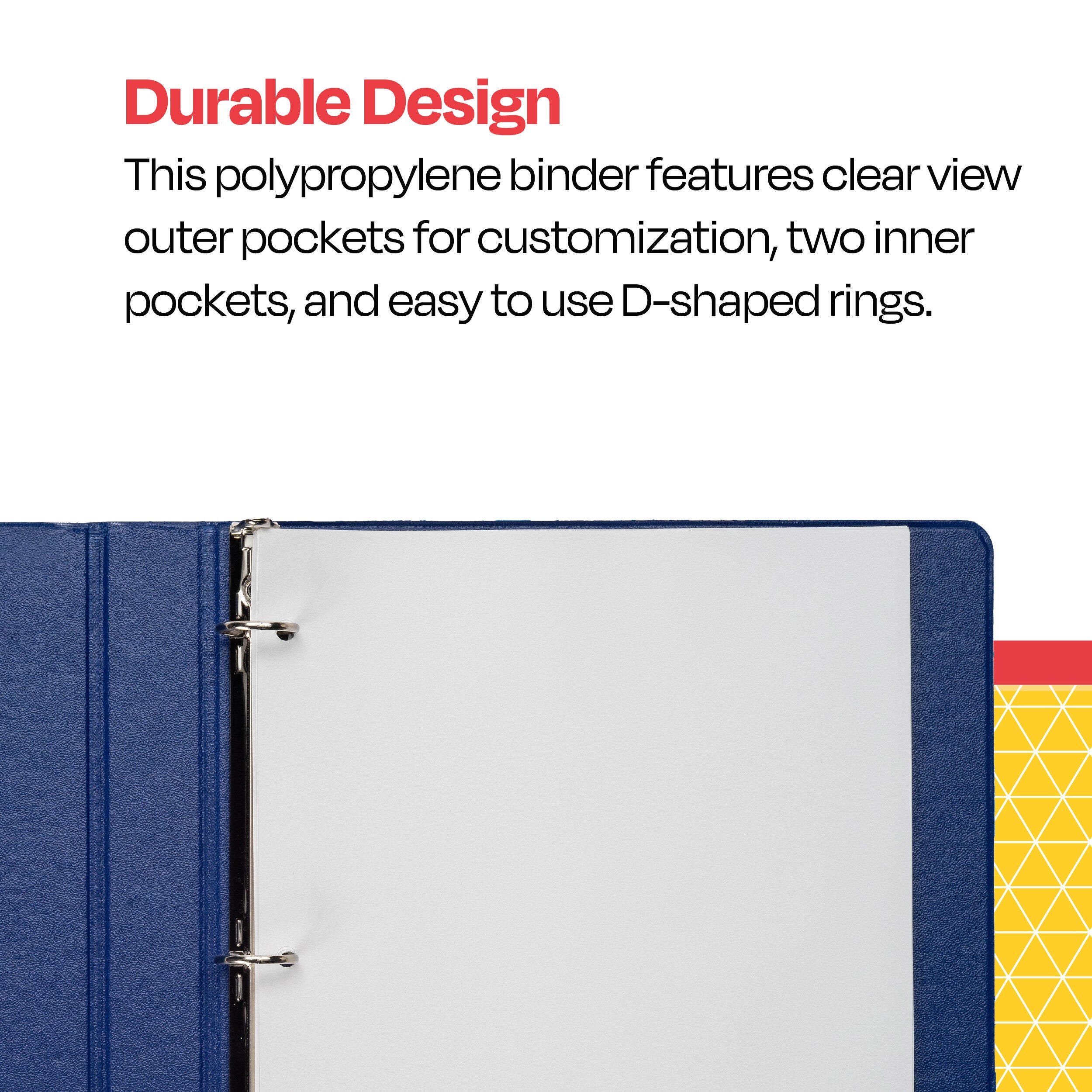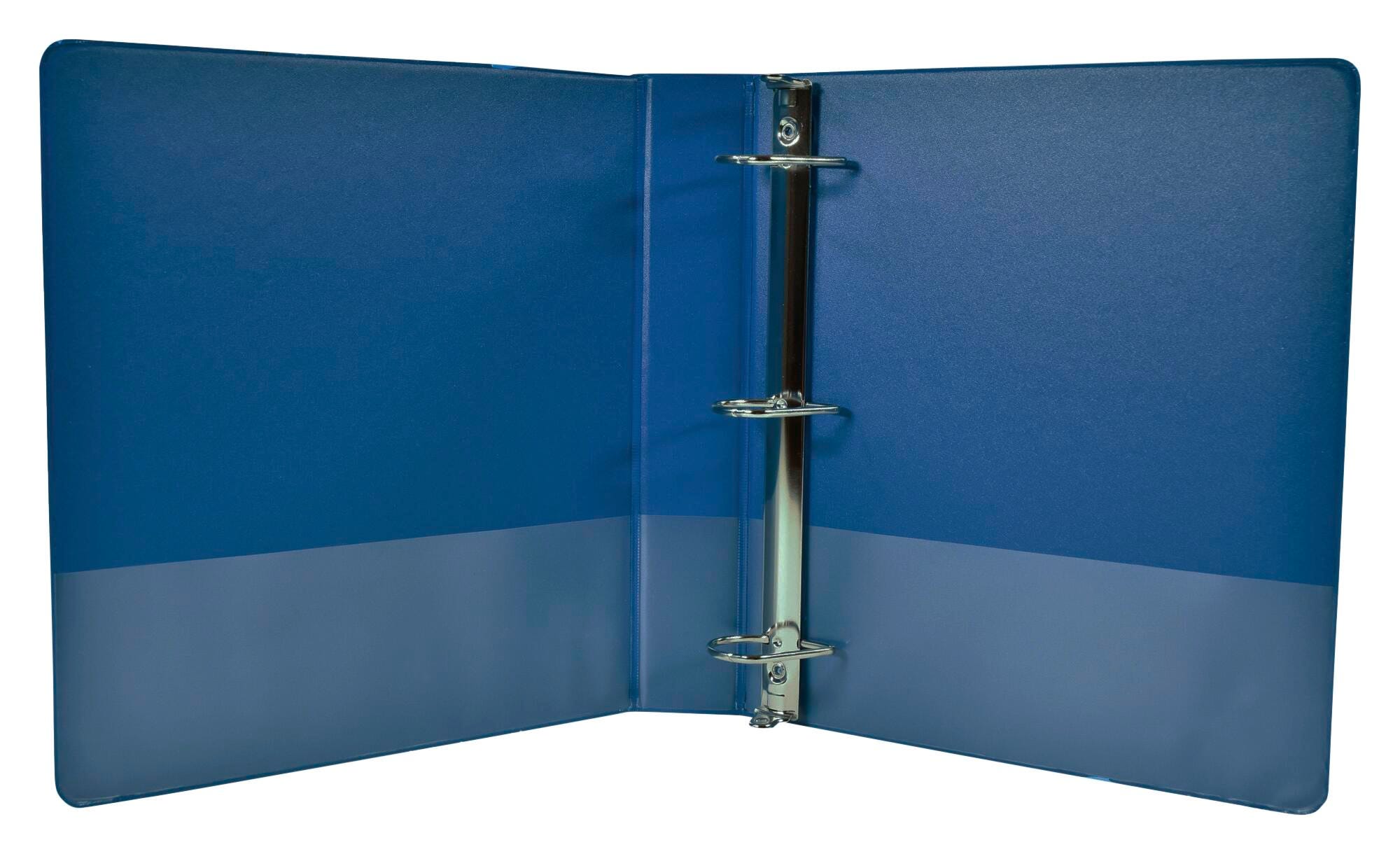 Compile important notes, papers, records, and other essential paperwork inside the School Smart blue 1-inch D-ring view binder. Our sturdy D-ring binder with view pockets has a convenient non-glare overlay on the spine, front, and back covers to allow you to insert custom labels or individual sheets for easy access and viewability. The clear pockets on the binder covers also prevent the transfer of ink from printed materials. The D-ring mechanisms are D-shaped and easy to open and close, so you can store and organize important sheets of paper in your 3-ring binder. Made of polypropylene, the sturdy binder also has two deep inner pockets to hold loose sheets of paper. Our D-ring file has a 225-sheet capacity, and the entire blue binder measures 10 x 11-1/2 inches.