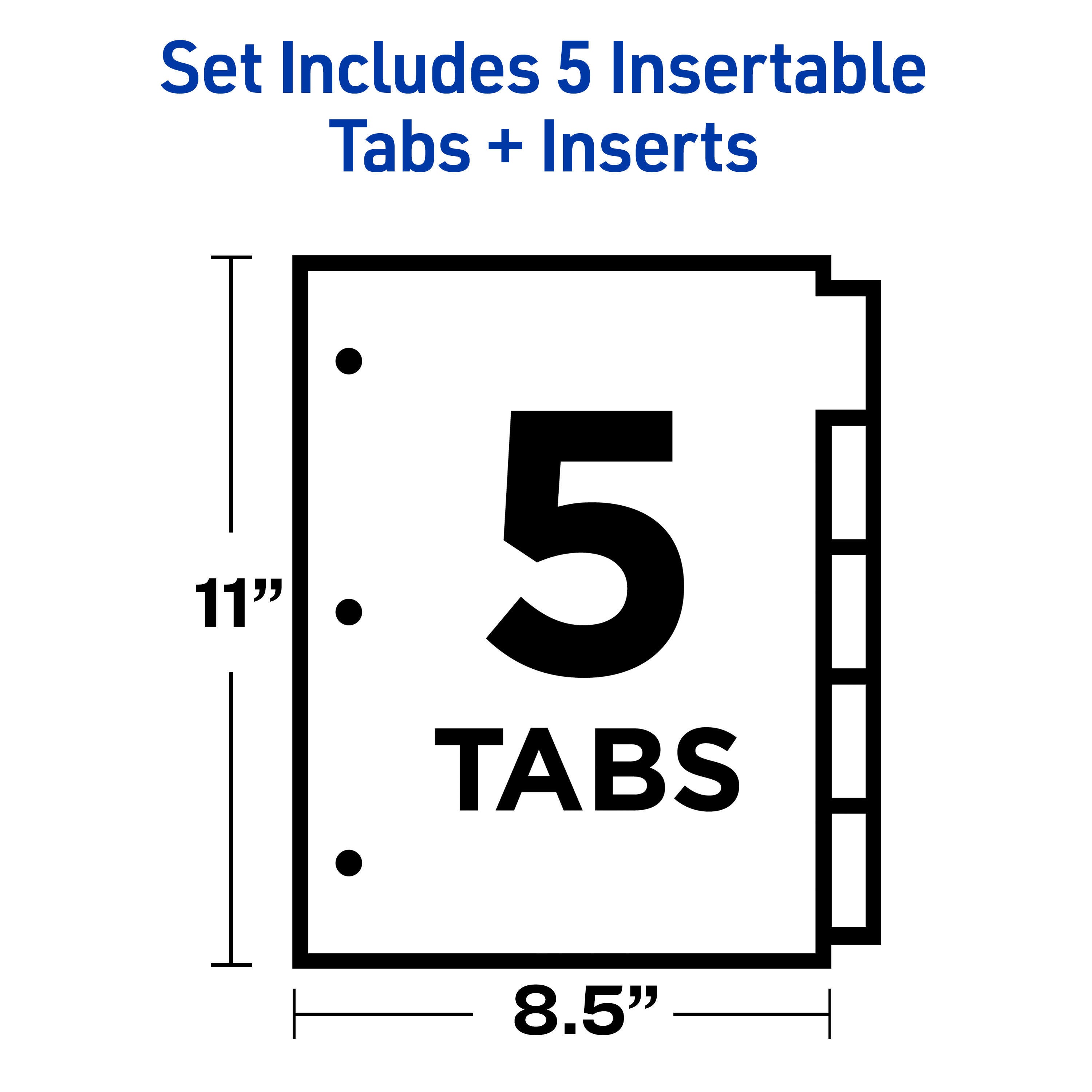 Avery Buff Stock/Clear Worksaver 5 Tab Insertable Divider comes with a special tab design that secures insertable tabs making them easy to insert and remove. Divider featuring double-sided, gold-reinforced edges has big tabs that provide 50% more printing space for tab titles. Tab inserts can be created and updated using laser or inkjet printer, sold as 24 sets.