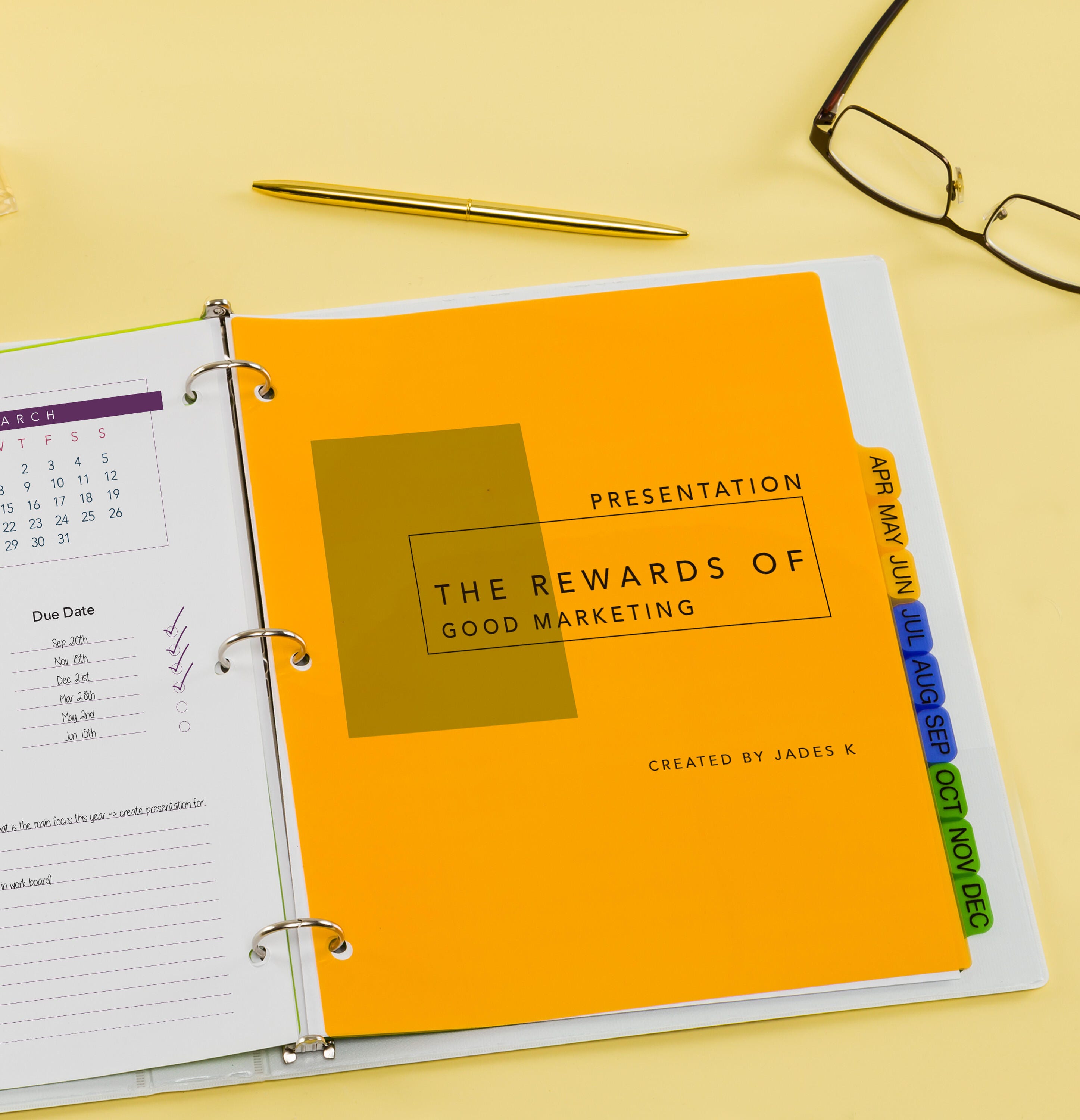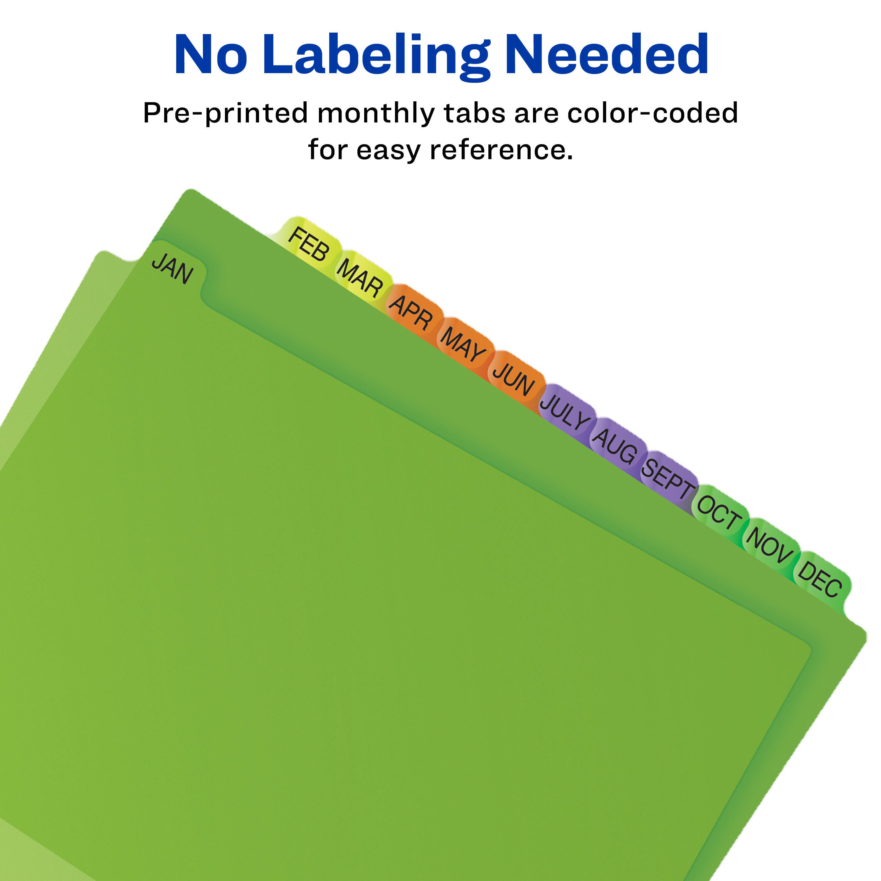 Plastic dividers with preprinted tabs organize documents quickly and easily. 12 preprinted tabs are labeled Jan-Dec on the back and front for quick referencing and retrieval. Three-hole punched edges make the dividers ready for insertion into standard, three-ring binders. Durable, translucent plastic is ideal for frequent use and makes page-turning easy. Assorted colors include blue, green, orange and yellow.