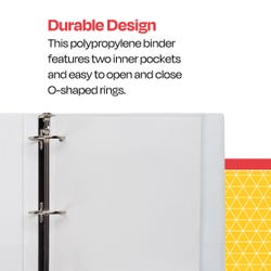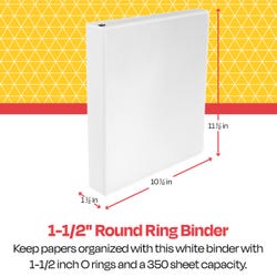 Arrange your most important notes, papers, and records in the School Smart white 1-1/2 inch round ring binder. Our O ring binder design has a heavy-gauge chipboard front, back, and spine with a durable suede vinyl cover for extra protection. The O ring mechanisms are O-shaped and easy to open and close, so you can organize and store essential paperwork in your 3 ring binder. Made of polypropylene, the 1-1/2 inch binder also has two deep inner pockets to hold loose sheets of paper. This O ring file has a 325 sheet capacity, and the entire white binder measures 10-1/2 x 11-1/2 inches.Features