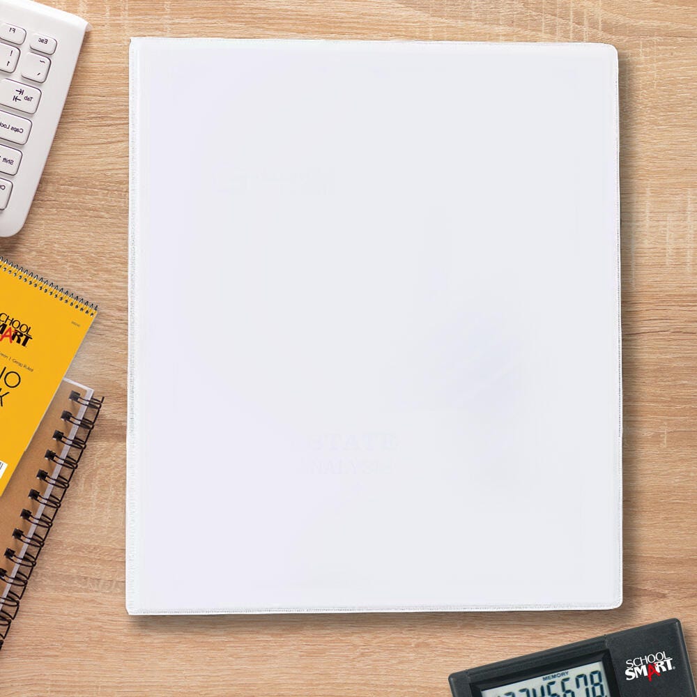 Arrange your most important notes, papers, and records in the School Smart white 1-1/2 inch round ring binder. Our O ring binder design has a heavy-gauge chipboard front, back, and spine with a durable suede vinyl cover for extra protection. The O ring mechanisms are O-shaped and easy to open and close, so you can organize and store essential paperwork in your 3 ring binder. Made of polypropylene, the 1-1/2 inch binder also has two deep inner pockets to hold loose sheets of paper. This O ring file has a 325 sheet capacity, and the entire white binder measures 10-1/2 x 11-1/2 inches.Features