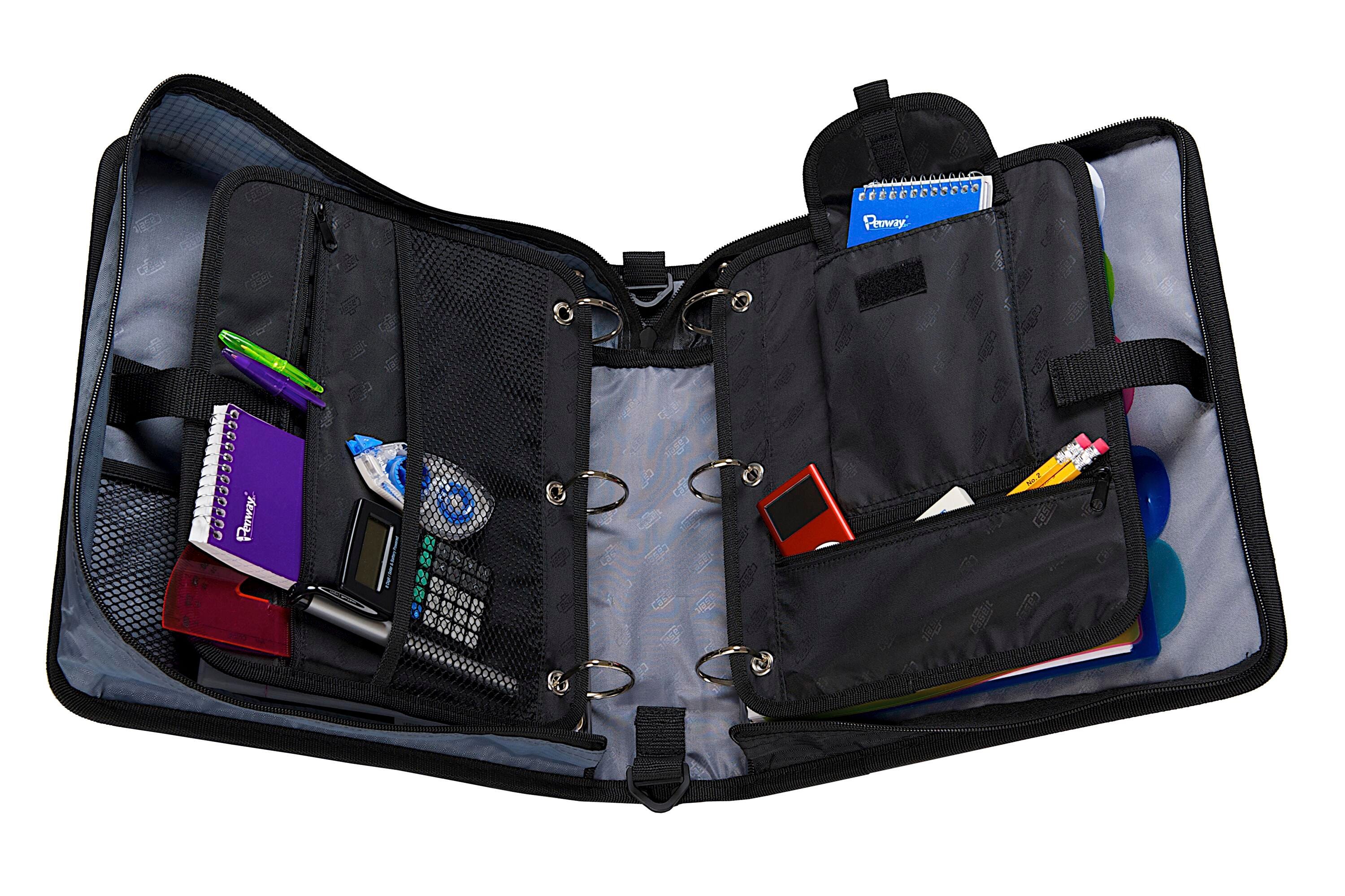 Case·it 1-1/2 inch zippered binder has two sets of D-rings and 3 inches total capacity. Features a removable pencil pouch, hook and loop hold-down pages, handle and shoulder strap. Ripstop material's square pattern traps punctures to prevent tearing, and the patented angled zipper keeps gusset out of the way when writing. Contents of binder sold separately.Features