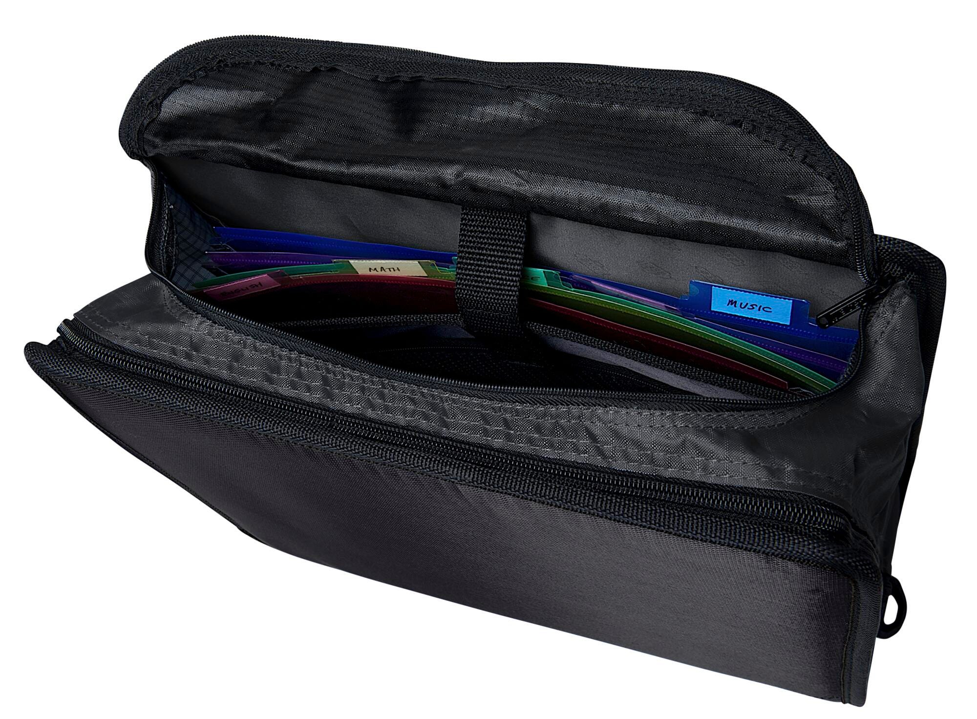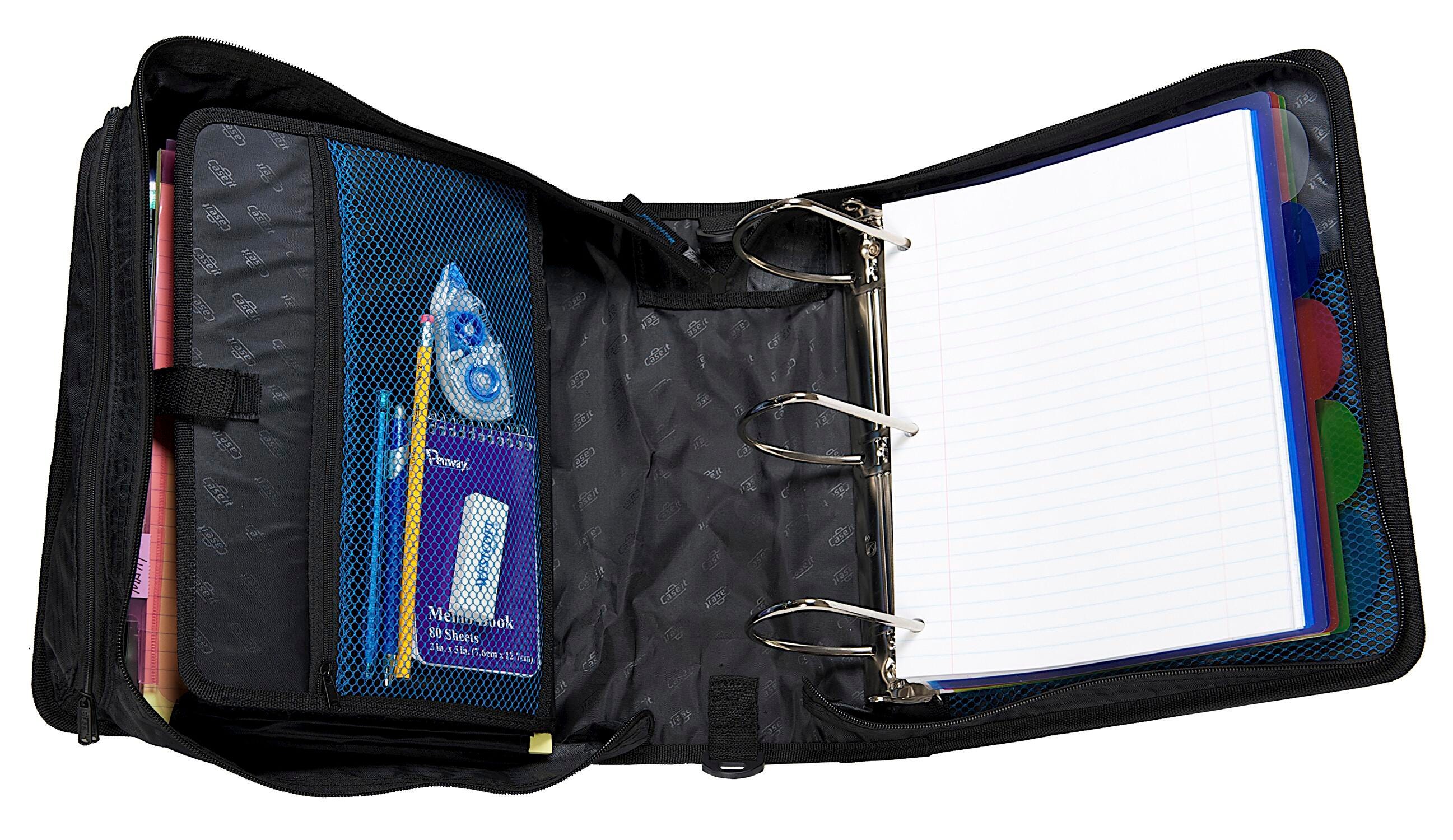 Case·it 4-inch zippered D-ring binder features a 5-color tabbed expanding file, inside mesh pockets, handle and shoulder strap. The ripstop material's square pattern traps punctures to prevent tearing, and the patented angled zipper keeps gusset out of the way when writing. Binder measures 13-1/4 L x 13-1/4 W x 5 D inches. Contents of binder sold separately.