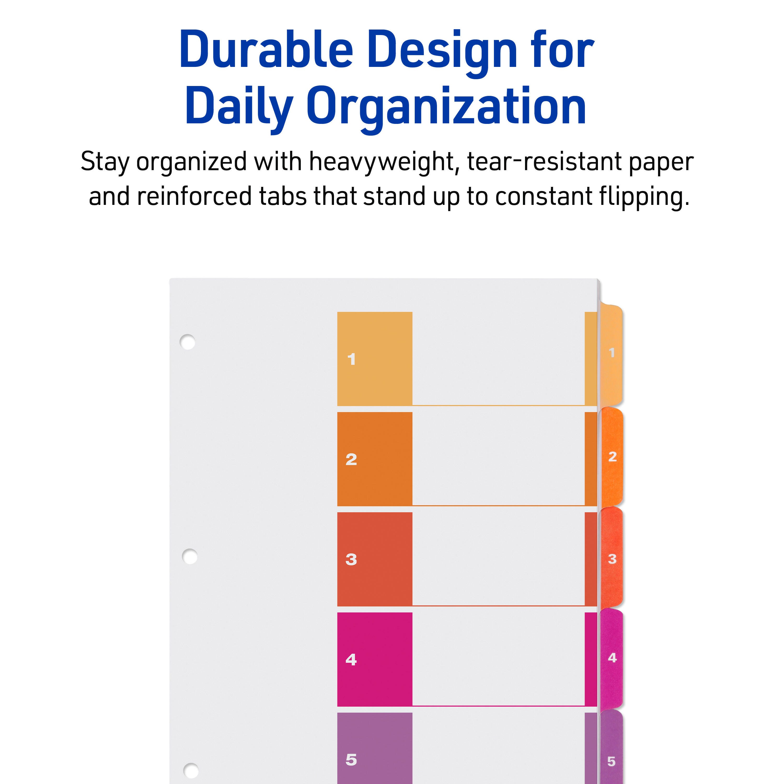 Avery Ready Index Table of Contents Dividers, Numbering 1-5 Tabs, are the fastest way to organize with impact. The coordinated system of a reinforced Table of Contents page and matching preprinted tab dividers makes referencing easy while delivering a professional look. Customize the Table of Contents page by adding section titles, as well as graphics or a company logo. Extended tab reinforcement and double-sided hole reinforcement on heavier weight paper prevents tearing, even with frequent use. Use in portrait or landscape formats. Easy to customize with free templates and designs at Avery Design and Print (avery.com/print). Dividers contain 20 percent minimum post-consumer recycled paper. For laser and inkjet printers.