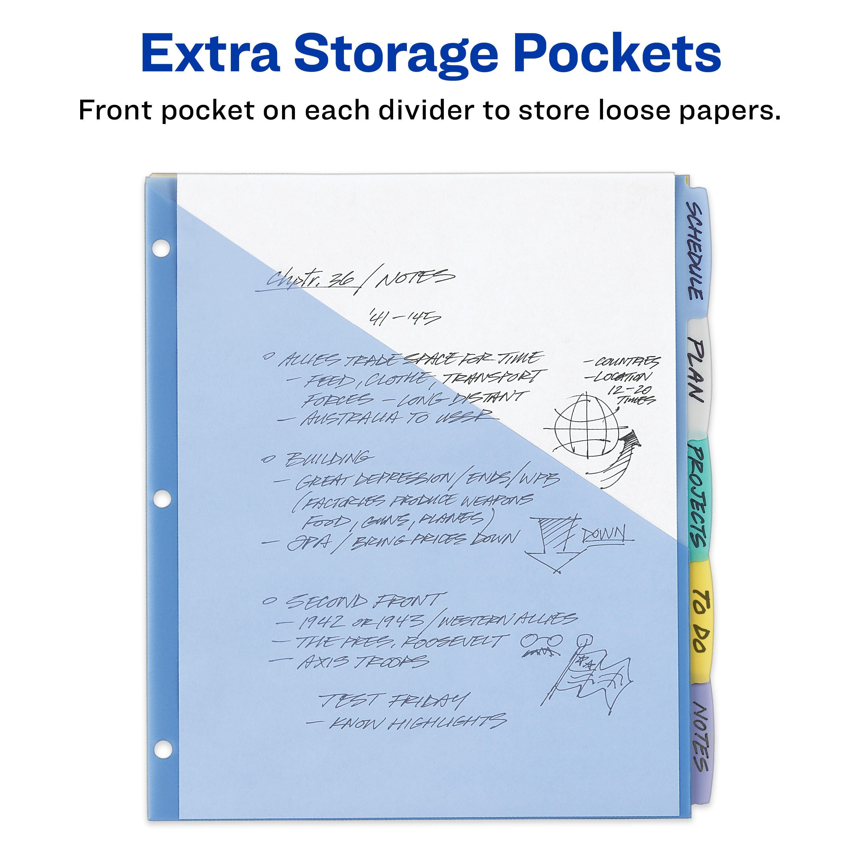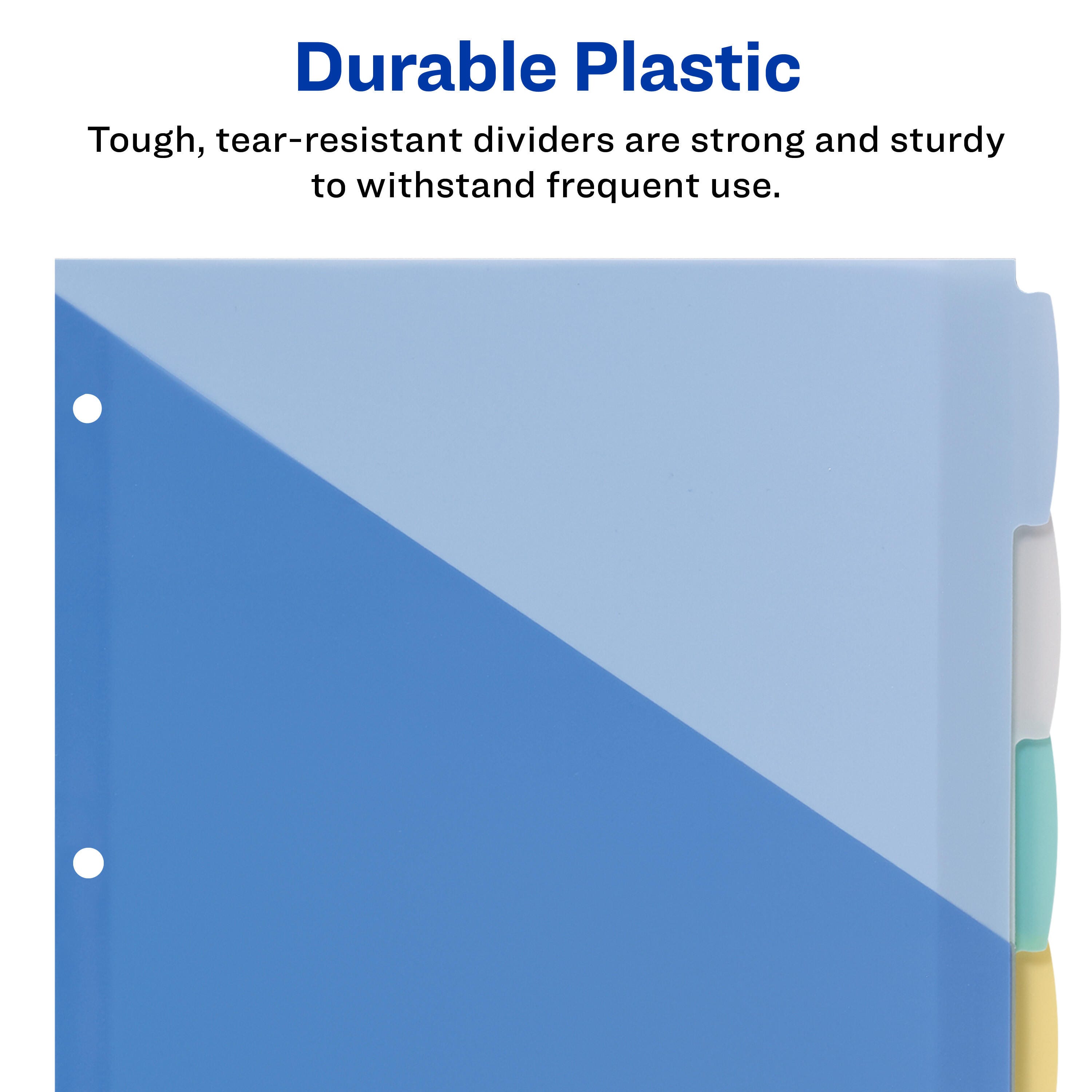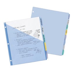 Organize your life in moments with this set of Write & Erase plastic dividers with pockets. Stylish tabs allow plenty of room and can be written on with a ballpoint pen or pencil. Reuse these dividers by simply erasing your old text and writing something new. These vibrant dividers add a jolt of color and personality to any project. Translucent pocket is ideal for storing class schedules, homework assignments, classroom syllabi and more. Diagonally cut pockets also make it easy to slip documents in and out in moments. Each divider pocket can hold up to 25 sheets and is assembled with a durable, tear-resistant plastic material that withstands frequent use. Use dividers for organizing classwork, planning dorm layouts or scheduling your week.