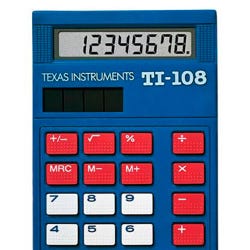 Texas Instruments TI-108 Solar Calculator ideal for grades K - 3, has four basic function keys plus percent, square root, plus/minus key and an automatic constant, all color coded in sturdy plastic to withstand use from the younger kids. Colorful calculator with large plastic keys is light-powered and does not require any batteries. Sold as a set of 10 calculators. Cardboard storage box included.Features