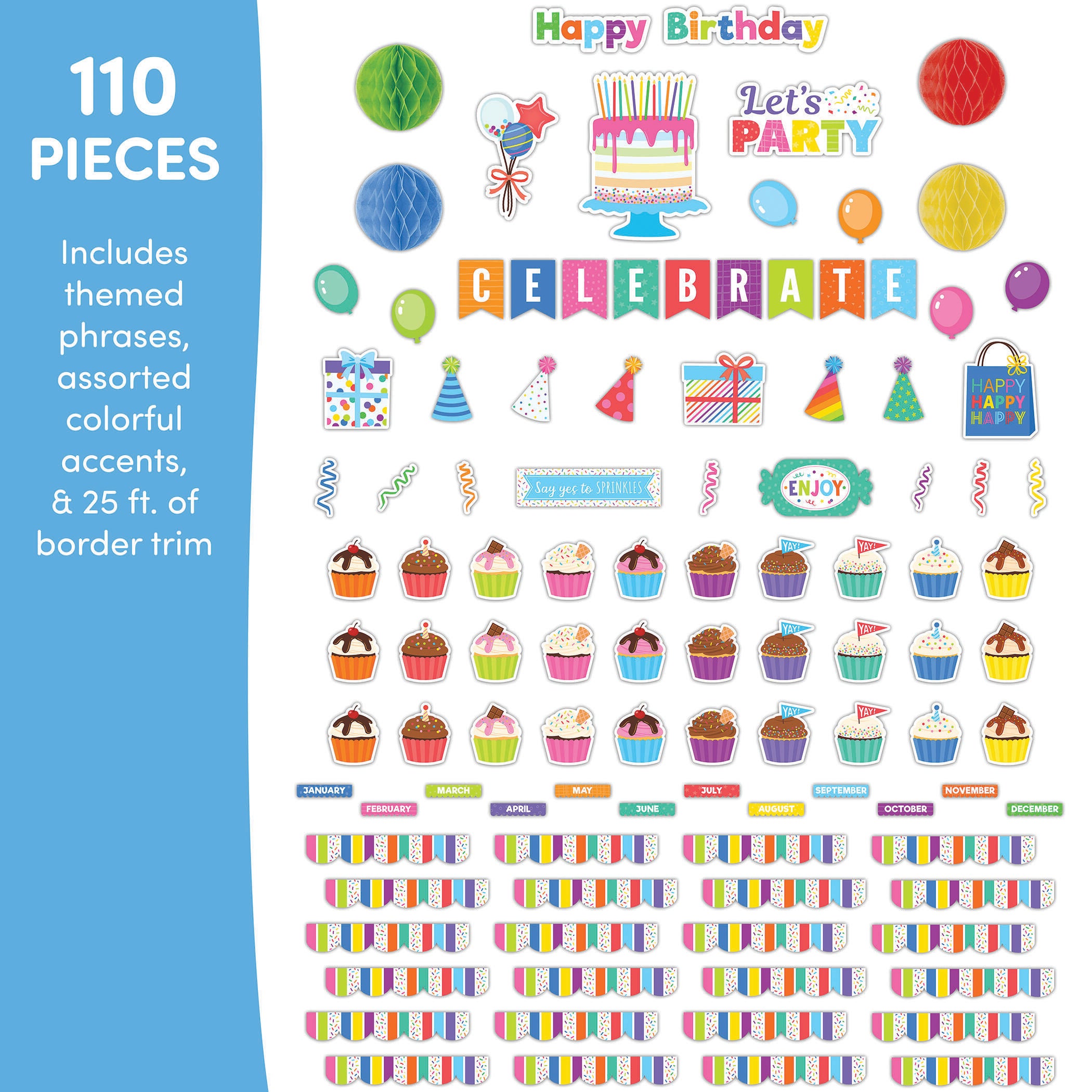This all-in-one decorating kit from Teacher Created Resources helps you create a fun and celebratory atmosphere is minutes! This kit delivers everything you need for birthday celebrations in the classroom, letting you focus on making memories without the hassle. These colorful paper decorations allow you to freely embellish your space and can be customized to suit your own unique vision or occasion. This set contains a total of 110 pieces.