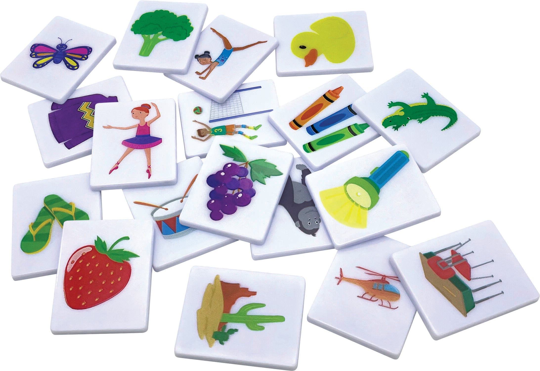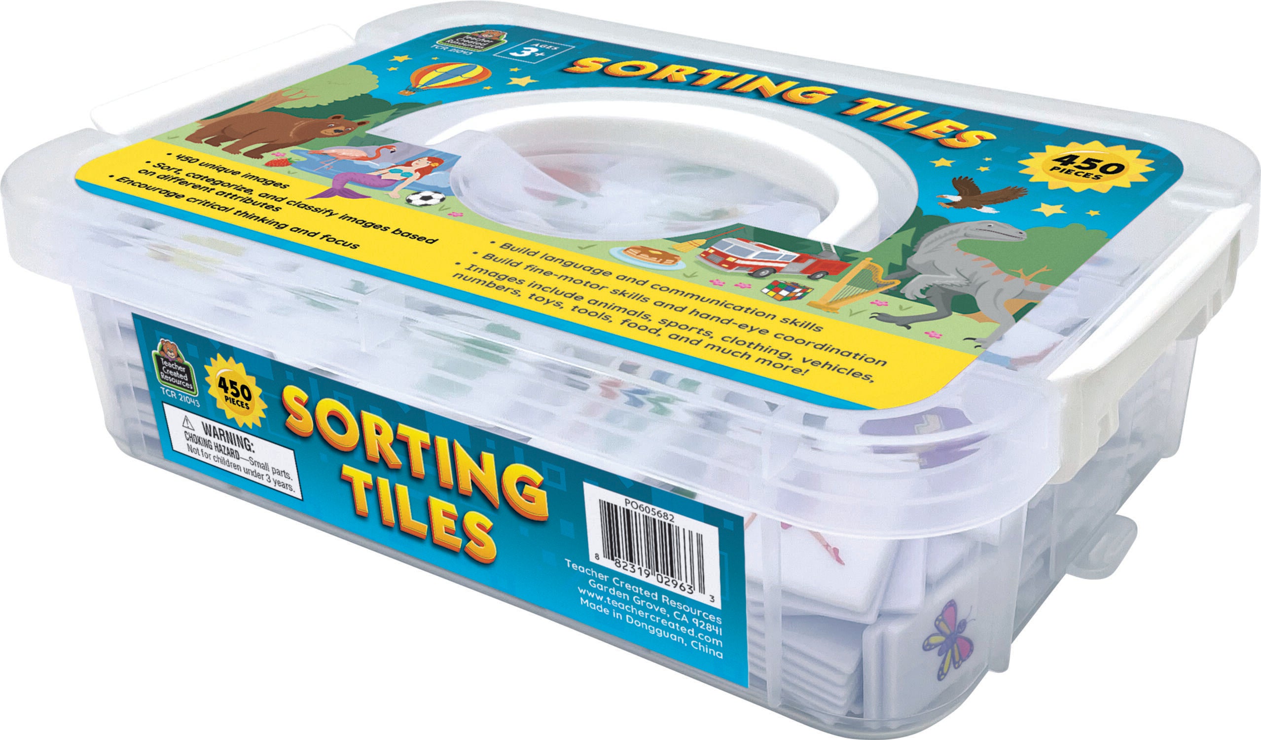 This collection of plastic Sorting Tiles from Teacher Created Resources provides a versatile learning tool for countless interactive activities. The tiles each have a unique image for organizing into groups or categories. Students can separate the images into categories based on shape, color, theme, spelling, or word sound, depending on age and learning goals. The easy-to-identify illustrations include food, animals, sports, toys, colors, numbers, shapes, tools, nature, occupations, weather, and more. Their one-sided design allows the tiles to be arranged facedown for memory and matching activities. The set includes a book with suggested activities to get your started.Features