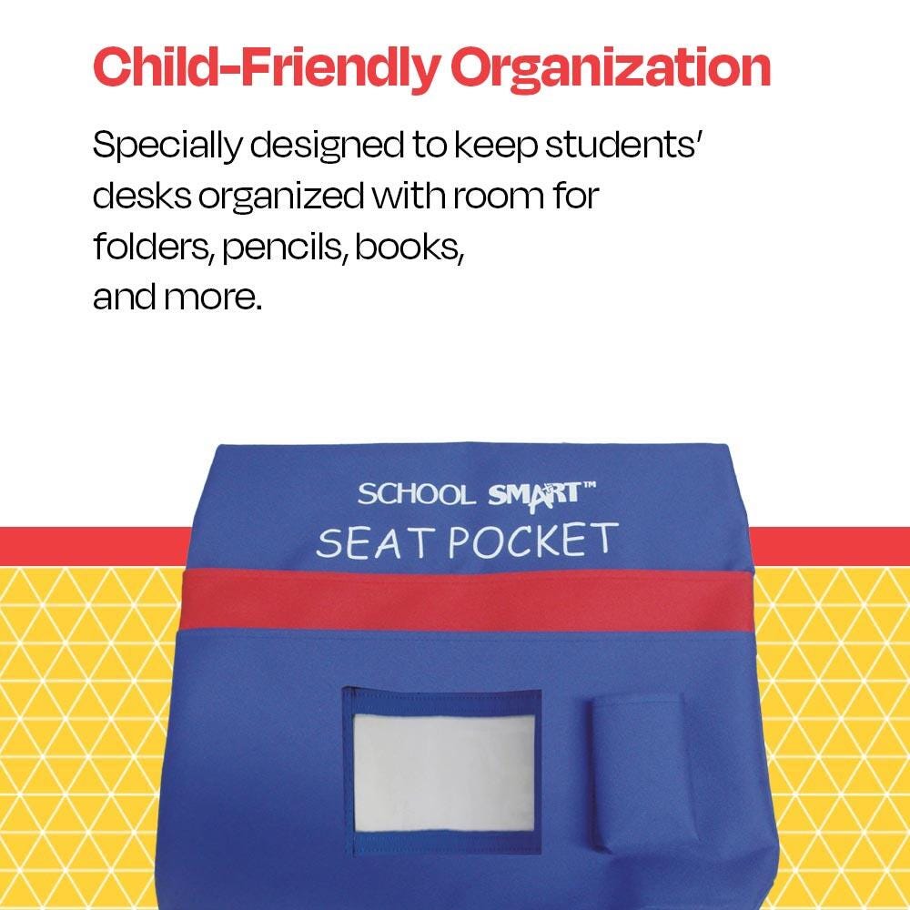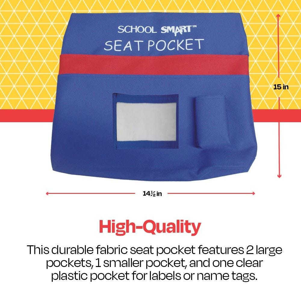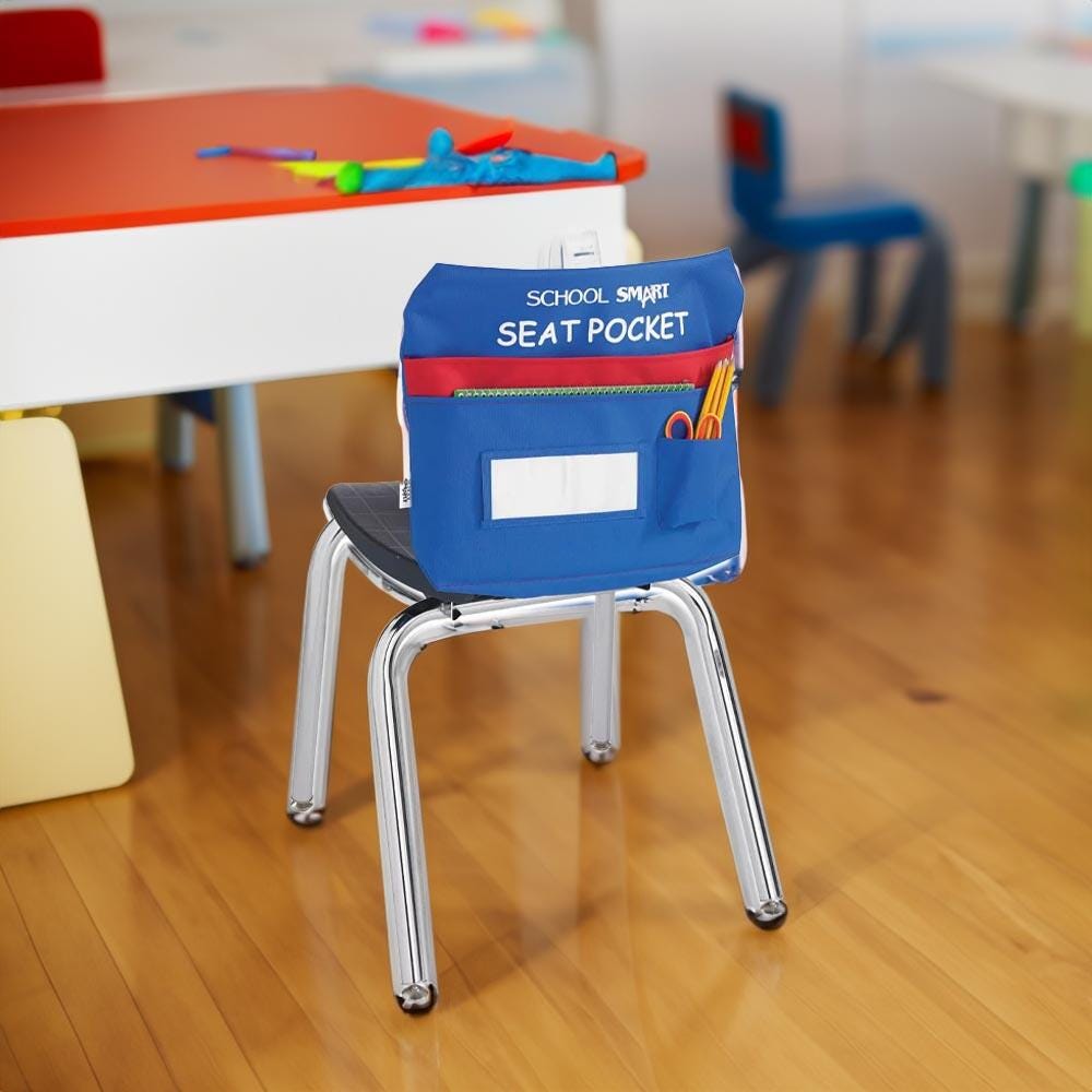 Keep your classroom organized with the help of the School Smart seat pocket. The blue seat sack easily slips over the back of a chair to provide extra storage and space for children. It features two main compartment pockets for larger items and additional pockets for a name plate and pencils. Seat sacks for student chairs are an easy and affordable way to stay organized.