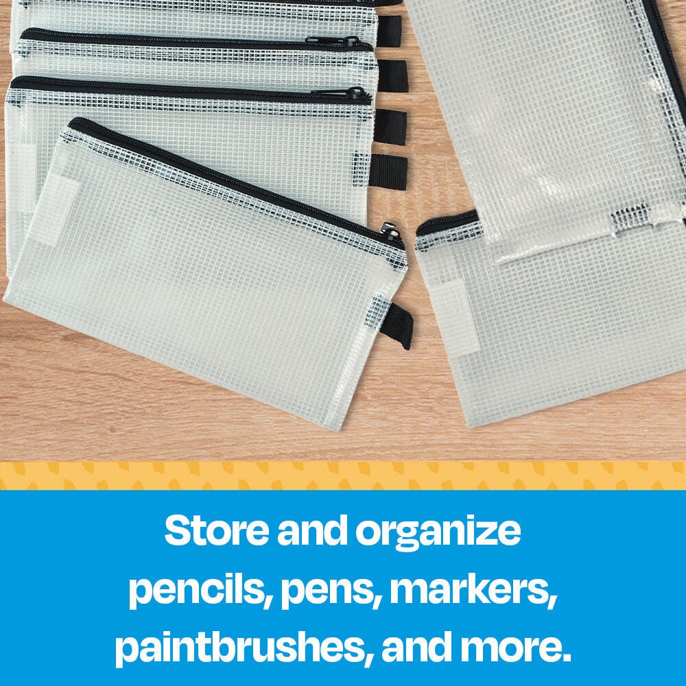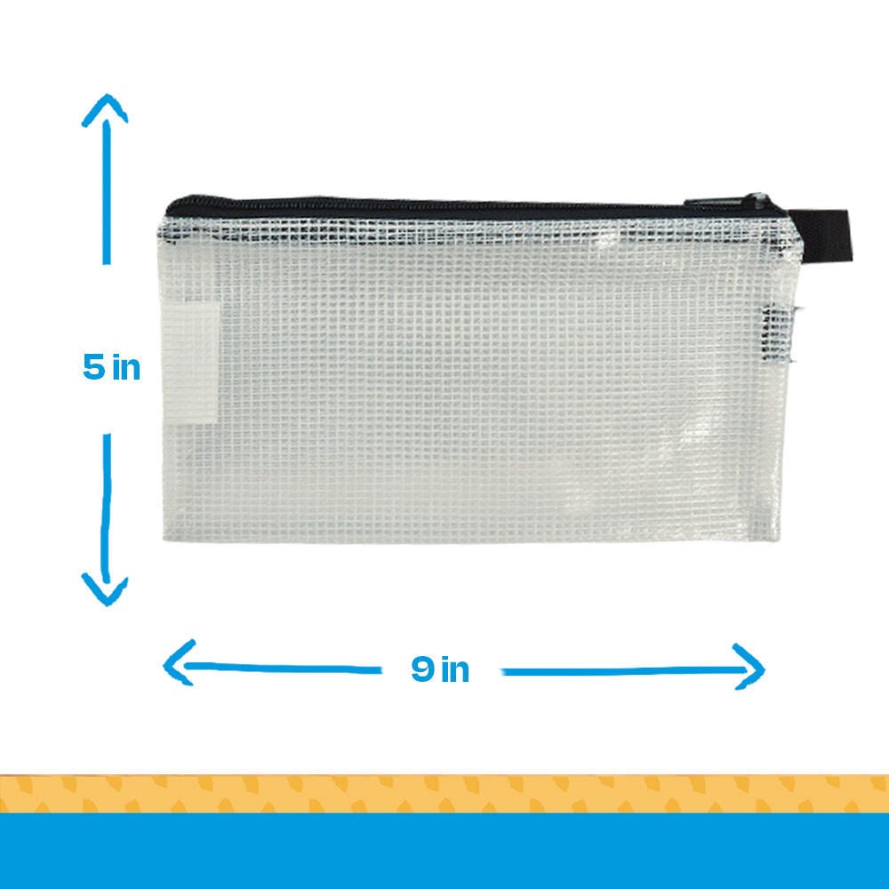 Sax mesh tool case pouches are a durable, reliable solution for storing small school supplies like pens, pencils, crayons, glue, markers, and paintbrushes. An easy-to-use zipper helps keep items all in one spot while the clear, see-through construction helps keep track of materials. The organizer measures 5 x 9 inches and features a fabric loop for hanging on wall hooks and lockers.