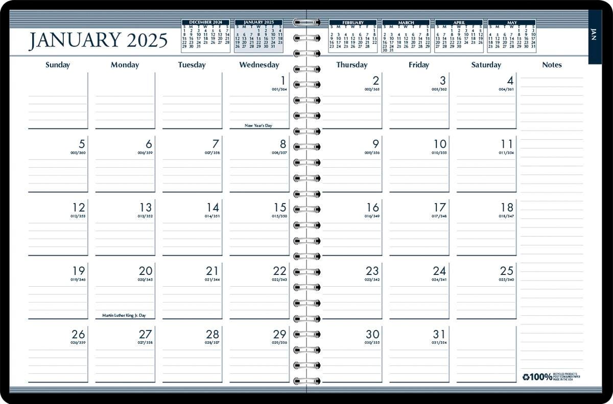 House of Doolittle offers high-quality planning solutions to help you stay on top of your busy schedule! This planner features an embossed faux-leather cover for a professional look and planning pages that cover 12 months, from January to December. Two-page-per-week spreads include ruled daily columns that have half-hourly appointment times from 8 AM to 9 PM, and Monday-through-Sunday scheduling. They also provide helpful information for comprehensive planning, including Julian dates and days remaining, a ruled notes section, monthly indicator tabs, and past, current, and two future months' reference calendars. The non-refillable planner also features paper made with 100% post-consumer recycled materials.