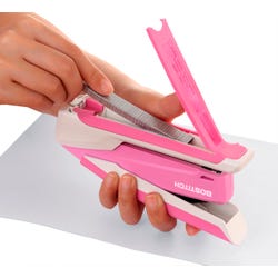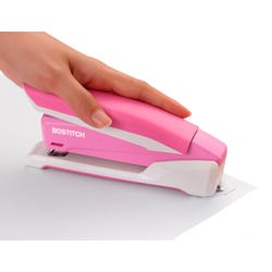 Power through your paperwork with Bostitch's inCOURAGE Desktop Stapler. The lovely pink design is compact and lightweight, yet staples up to 20 sheets using just 1 finger! Non-slip comfort grip makes stapling feel like a breeze, whether doing a few copies of paper or stapling for the long haul for big projects. Integrated staple remover at the back lets you remove staples at a moment's notice, while a staple storage compartment at the base lets you store 2 extra half-staple strips for refilling stapler as needed. This manual stapler uses standard size (1/4 inch) staples. Weighs approximately 1/2 pound. Includes 3-year limited warranty. A portion of the proceeds from this purchase is donated to cancer charities (including breast cancer) via the AMAX Spirit Foundation.