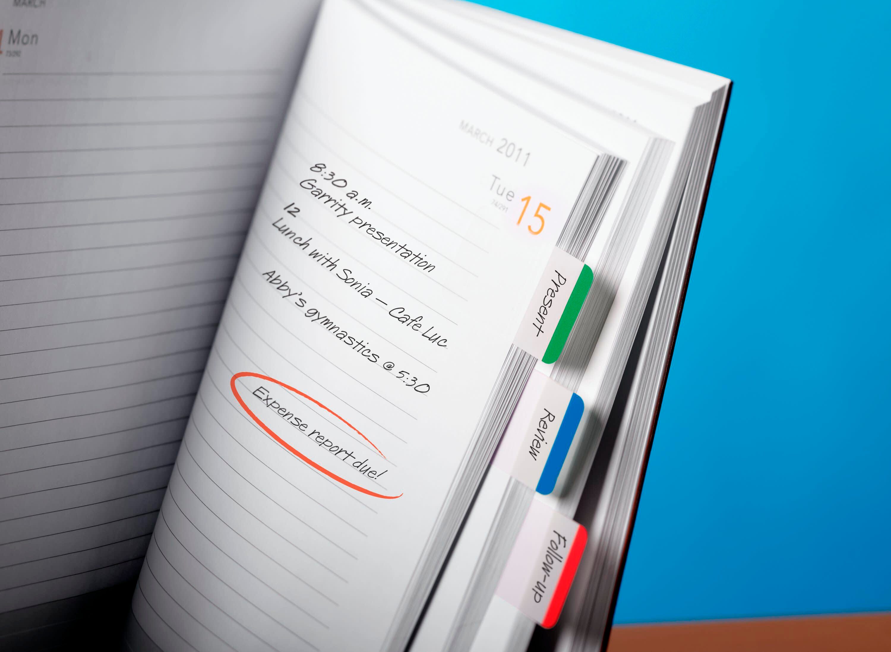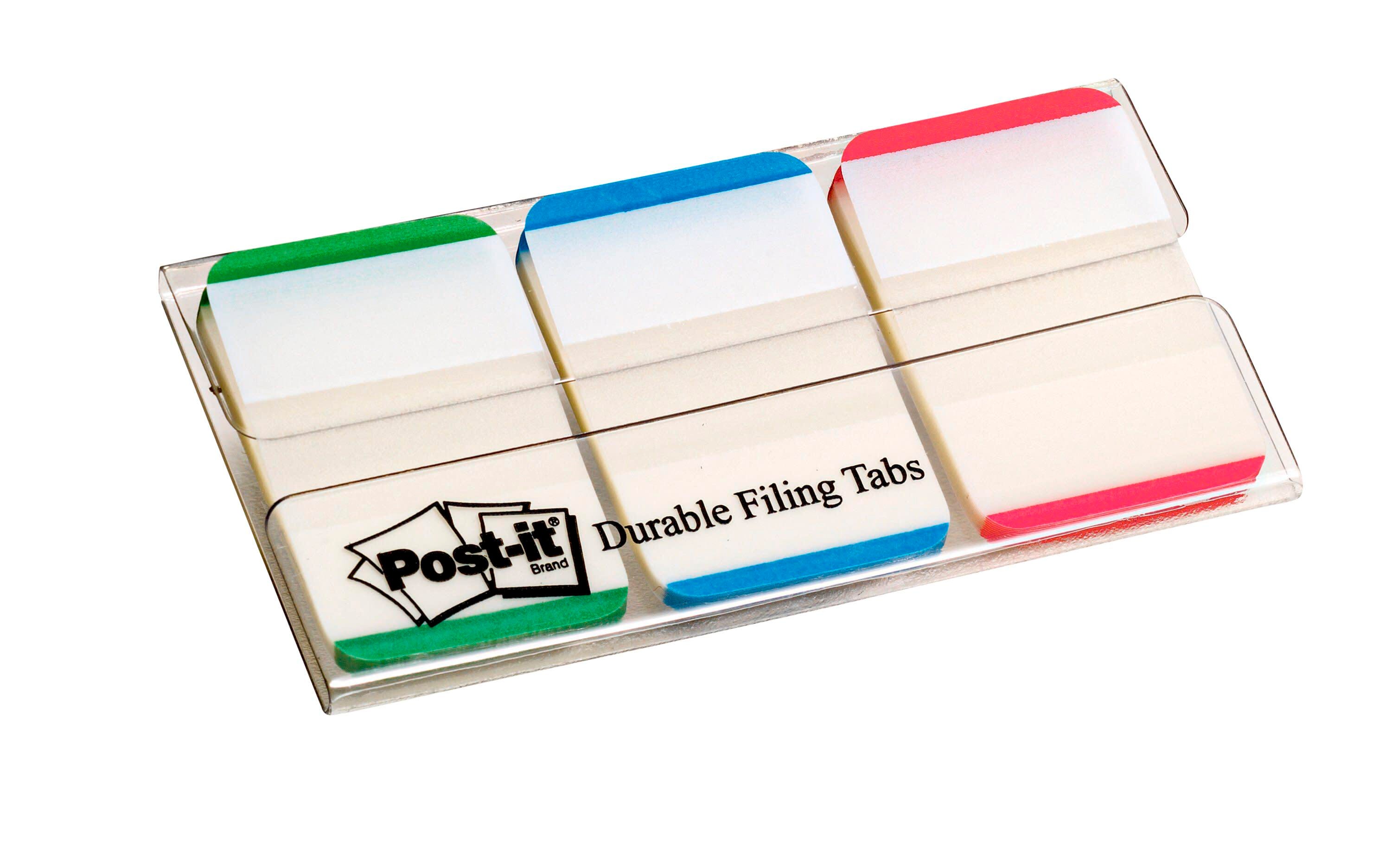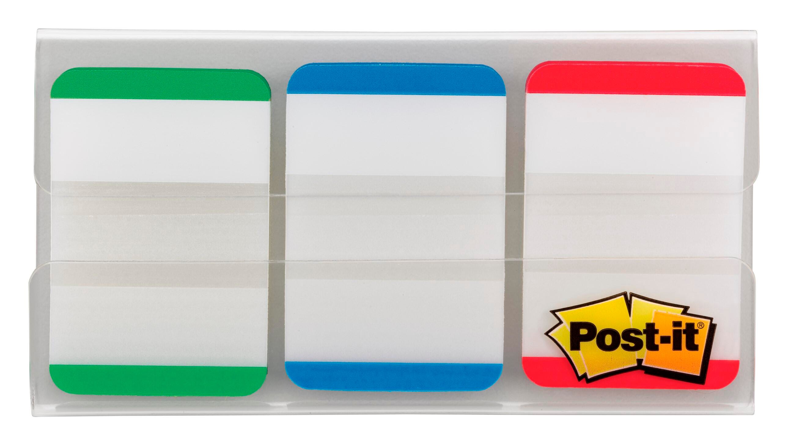 Post-it Tabs in 1 x 1-7/10 inch size create necessary order by easily organizing planners and calendars into sections. Lined color bars give you flexibility to organize by color. Tabs are durable, you can write on them, and reposition as needed. They are also great for binders, notebooks and file folders. Tabs stick securely and remove cleanly. Green, blue and red. Contains 22 tabs per color and 66 tabs total in an on-the-go dispenser.