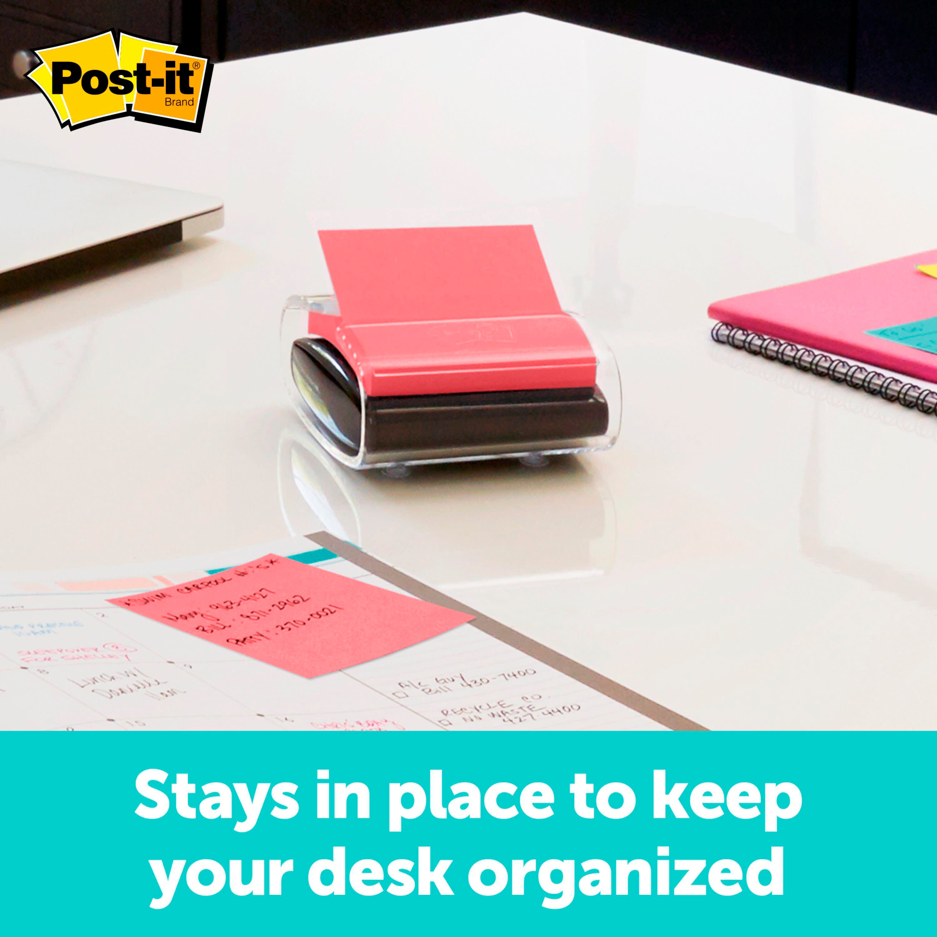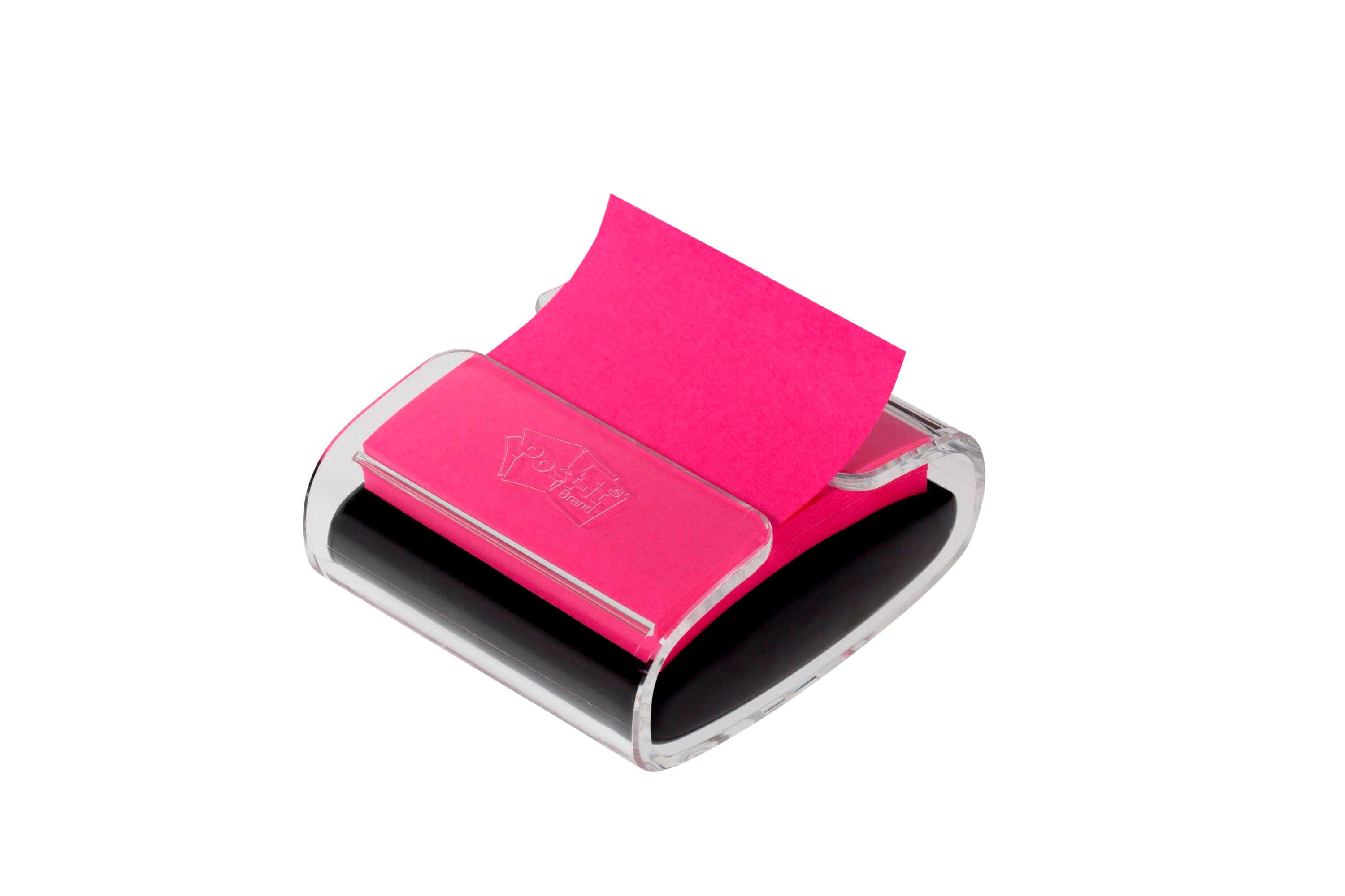 Post-it Pop-up Notes Black Wrap Dispenser with a modern design and a stylish look holds a pad of Post-it super sticky pop-up notes from the Energy Boost color collection. Dispenser has a simple, sleek design that compliments any decor and offers one-handed dispensing for enhanced convenience. It keeps your notes close at hand and provides a neat as well as an organized look to your desk. Dispenser comes with a clear outer shell to make colorful notes stand out.