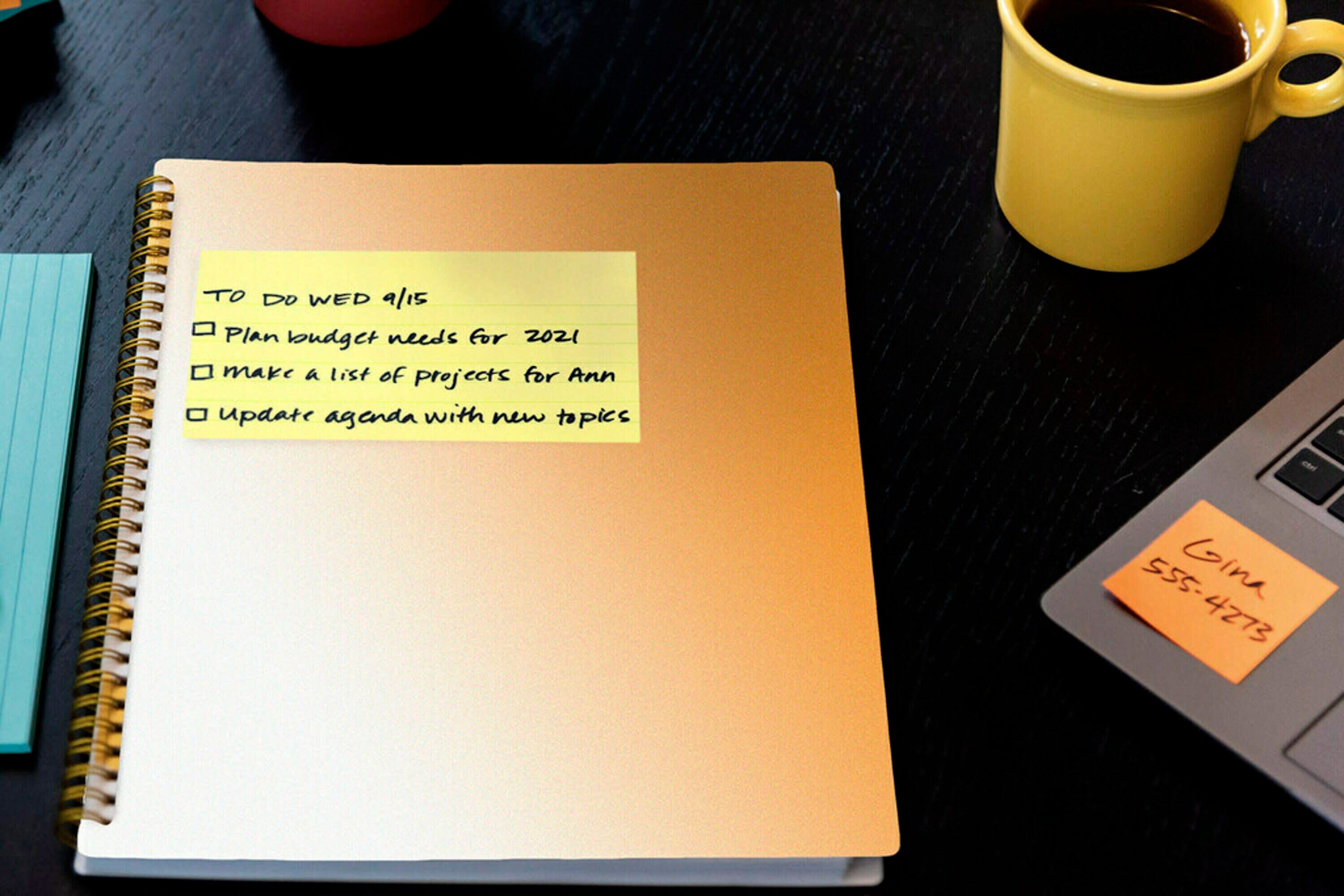 Post-it Notes come with a unique adhesive, which keeps your note in place, yet removes as well as repositions easily. Great for short and quick reminders that cut through the clutter.