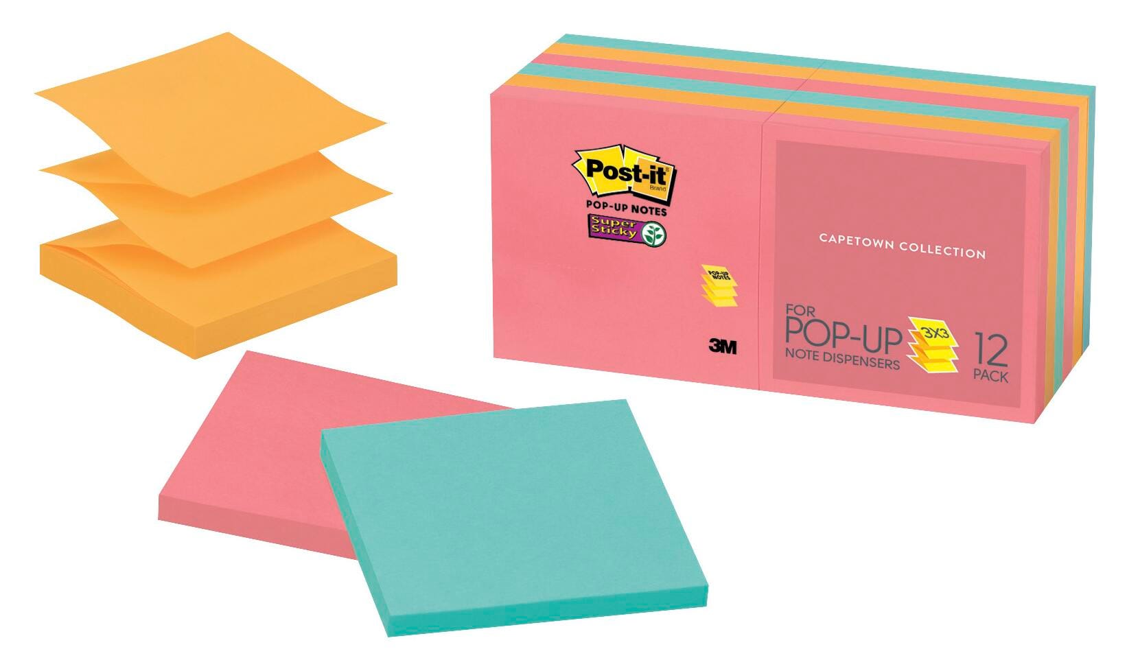 Post-it Pop-up Notes make it simple to grab one note at a time with one hand. The accordion-style notes pop-up from the weighted dispenser so you can always have a note at your fingertips. The 3 x 3-inch size are great for reminders or short to-do lists. Notes stay where you put them, yet they can be removed and repositioned easily. All Post-it Notes are recyclable. The paper in Post-it Notes is sourced from certified, renewable and responsibly managed forests. Sold as a pack of 12 pads; 100 hundred sheets per pad.Features
