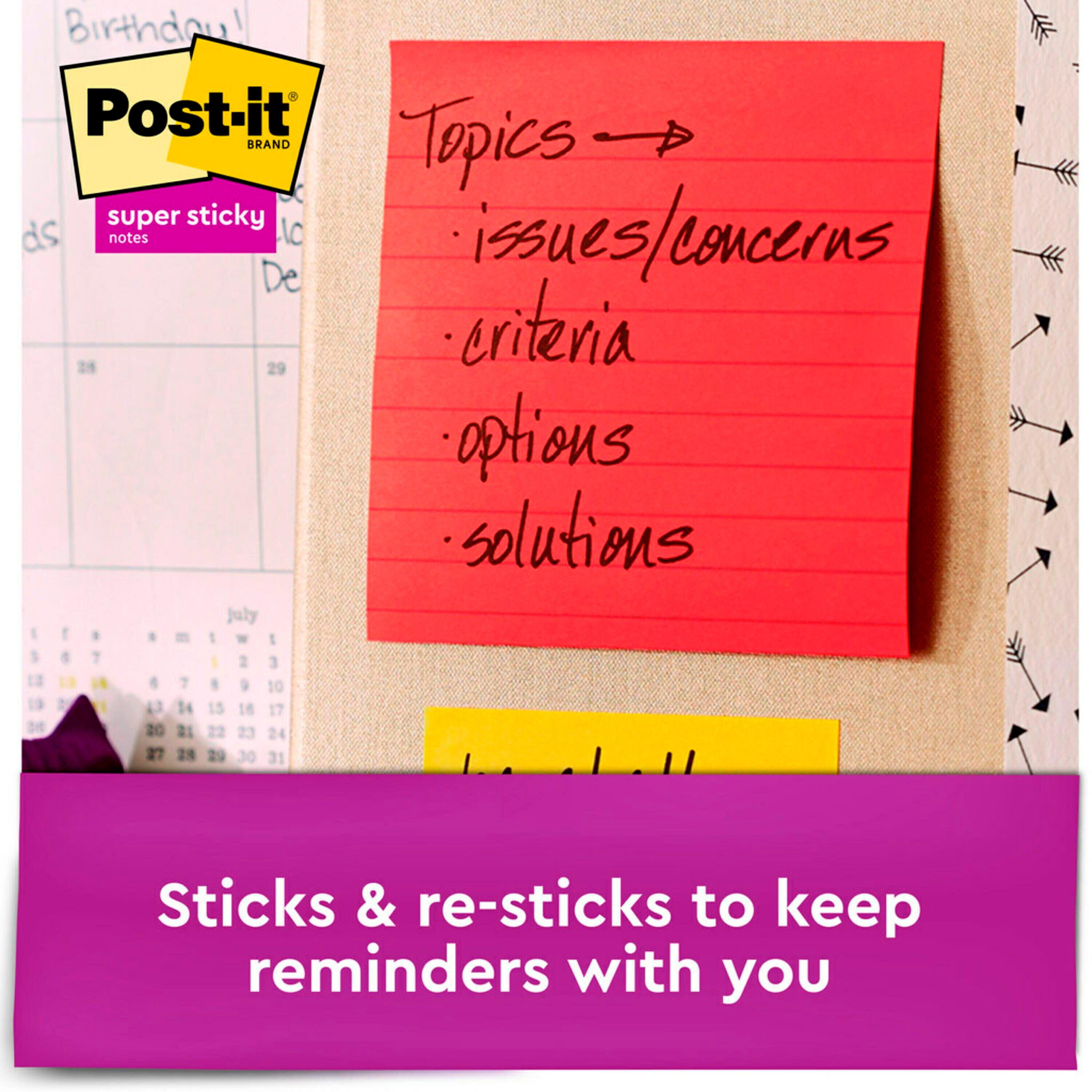 If you want to leave an unforgettable note or list, these Post-it Super Sticky Lined Notes have you (and your hard surfaces) covered! They DOUBLE the power of usual Post-it pads, staying reliably on vertical and hard-to-stick surfaces like doors and walls, while also still being easy to remove or reposition as needed. The 4 x 4 inch design offers just enough room to write the important details. Evenly spaced lines help keep your message straight. Each of the 6 included colors come in separate pads. Includes 90 sheets combined as a total.Features