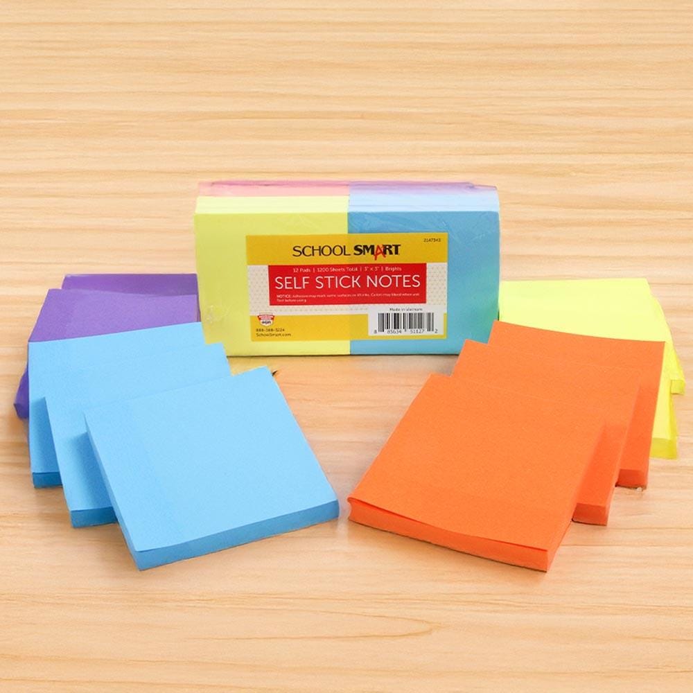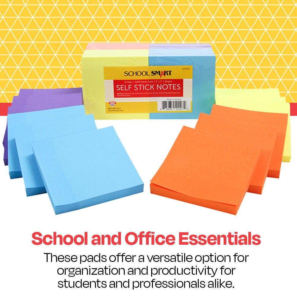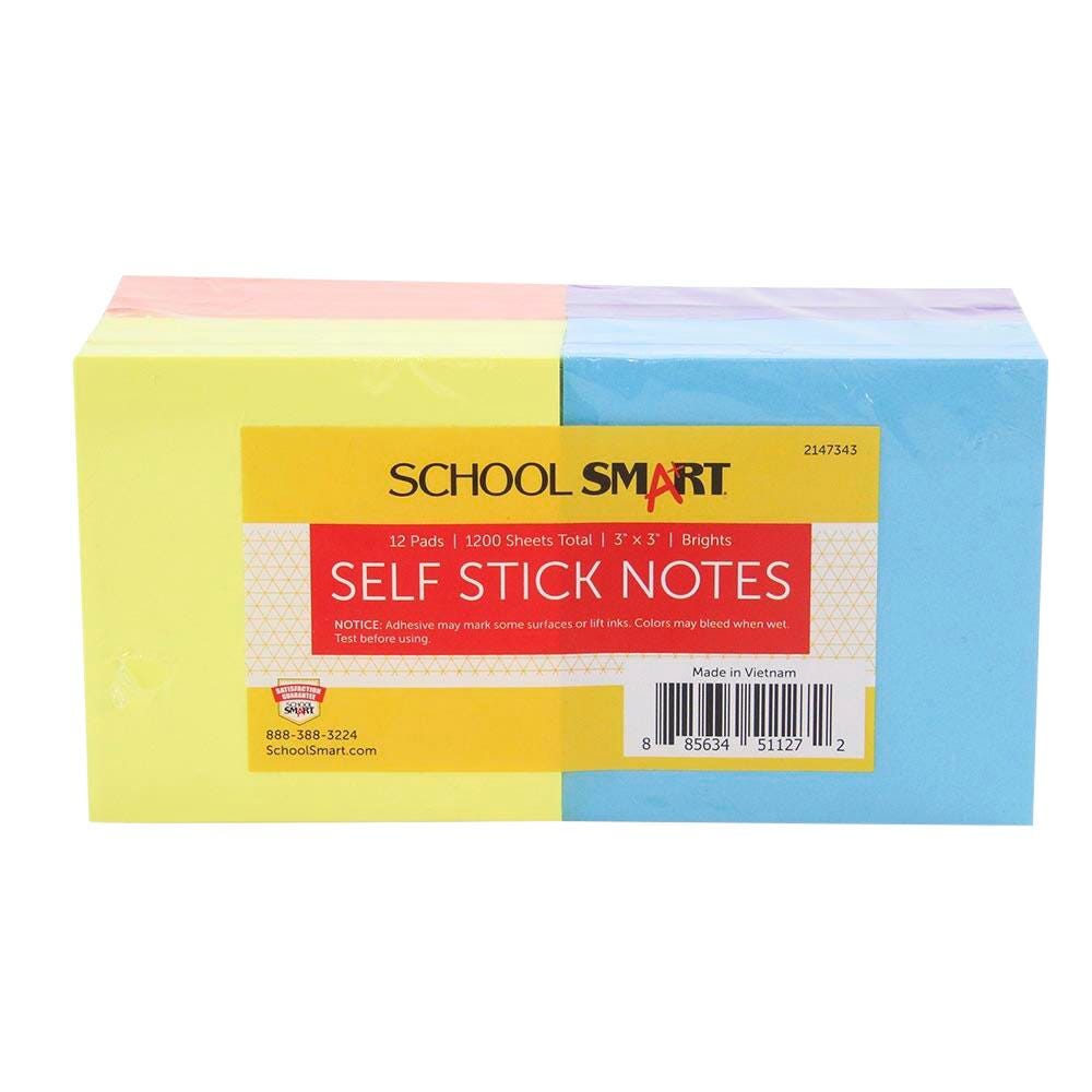 School Smart delivers this pack of Self-Stick Notes for colorful to-do lists, reminders, messages, and more! Each note features a reliable adhesive that provides a secure stick on most surfaces. The 3 x 3-inch notes provide enough room for jotting quick ideas, without taking up too much space on your desktop, planner, or monitor. Each pad contains 100 sheets. This pack includes 12 pads, 3 each in blue, green, yellow, and pink.
