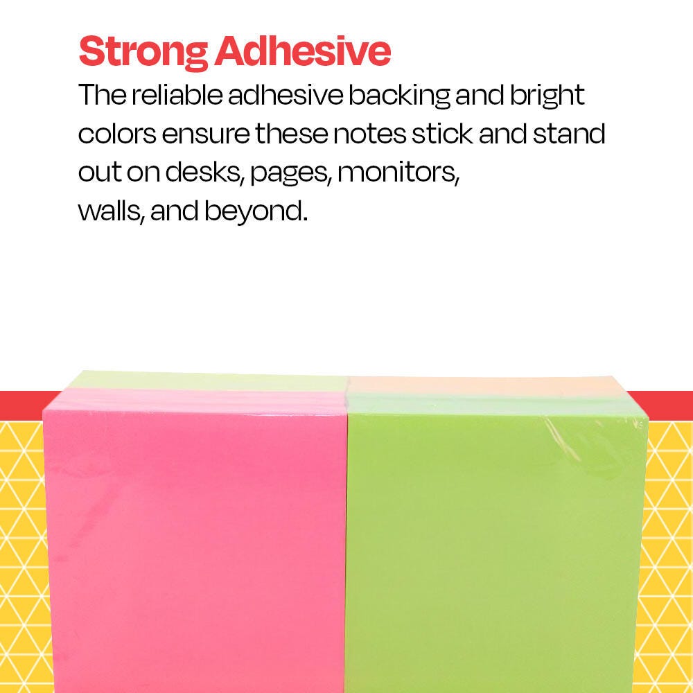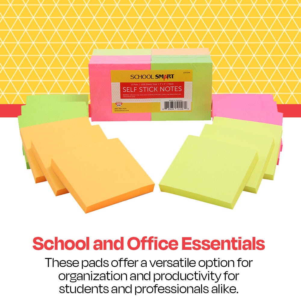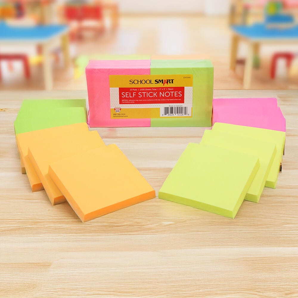 The School Smart Self-Stick Notes are an easy and budget-friendly way to leave messages for friends, coworkers, roommates, or yourself! Each note has a strong, durable adhesive that sticks to most surfaces. The 3 x 3 inch notes provide enough room for quick messages or reminders, without taking up too much space on your desktop, planner, or monitor. Suitable for all ages and any classroom or office! Each pad contains 100 sheets, and this pack contains 12 pads, 3 each of neon blue, neon pink, neon yellow, and neon green.Features