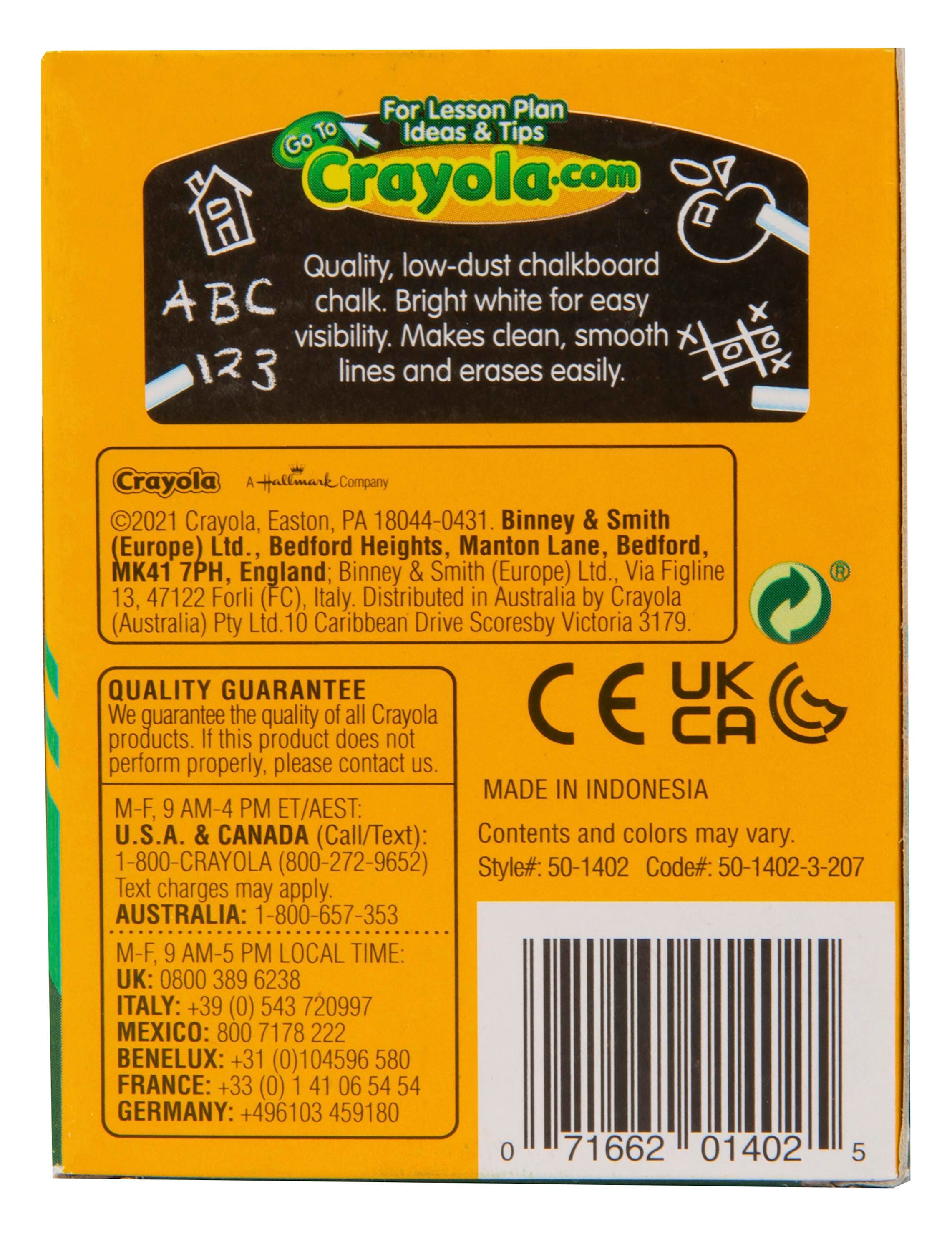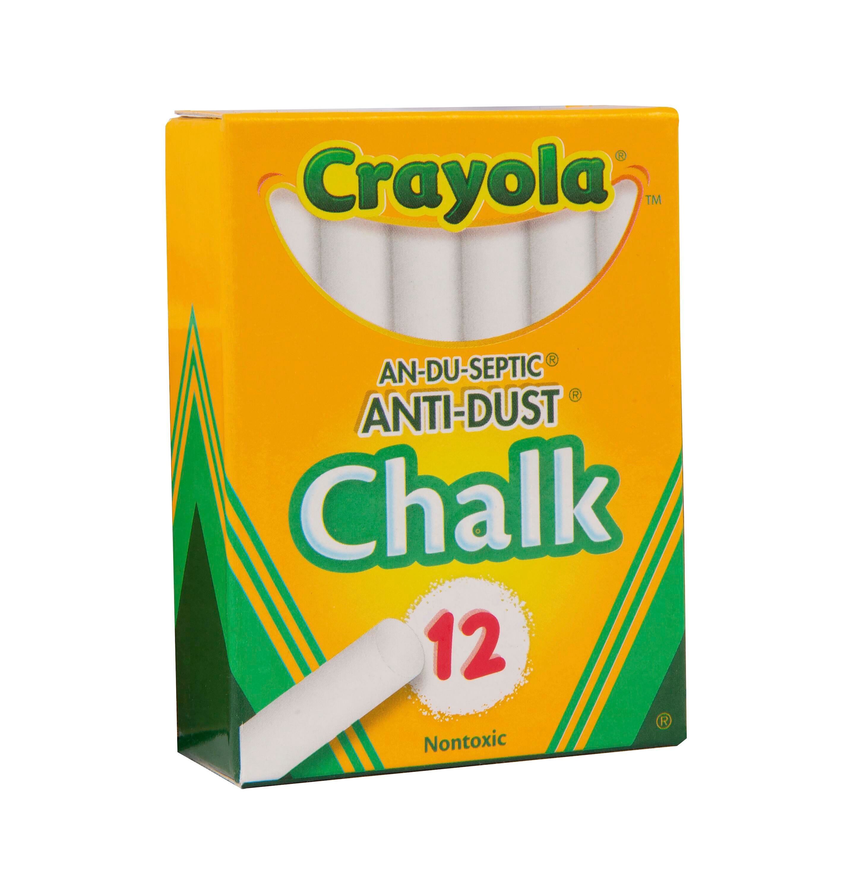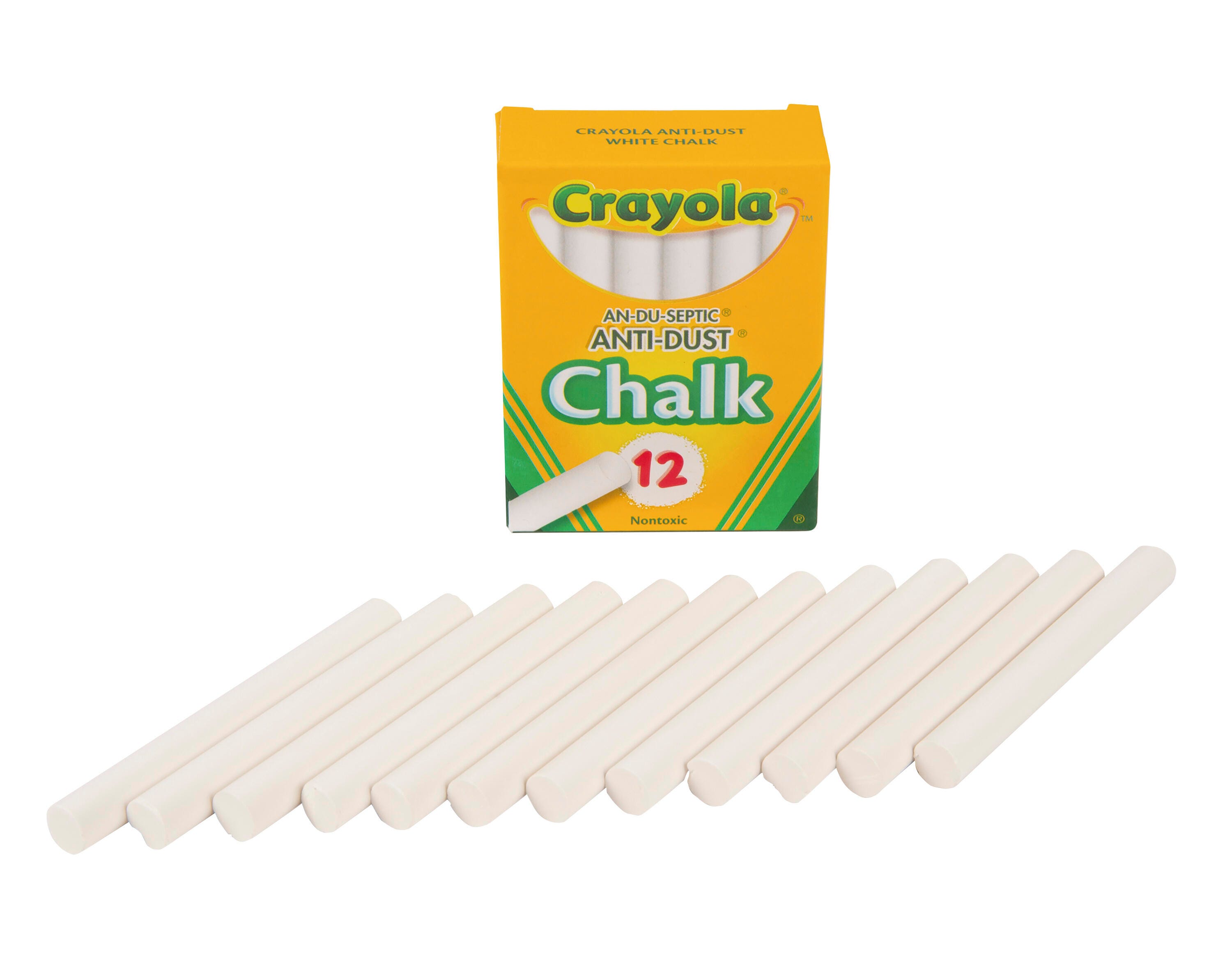 The An-Du-Septic® Anti-Dust® Chalk from Crayola is ideal for use on chalkboards in classrooms and beyond. This high-quality chalk leaves clean, smooth lines without the mess of excess chalk dust. This set contains 12 sticks of white chalk.