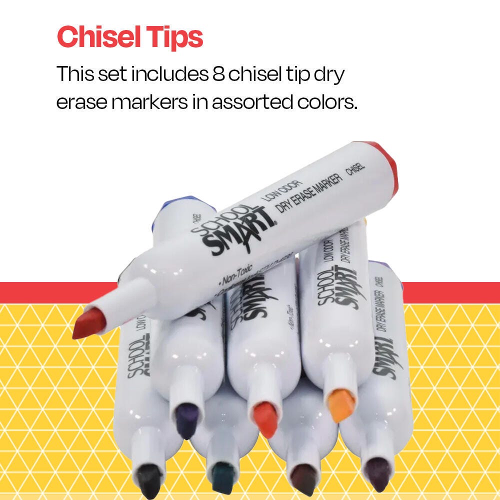 School Smart assorted color dry erase markers are great for teachers, students, and office professionals. Use the low odor dry wipe marker pens for group lessons, problem-solving, daily schedule displays, and more. Convenient chisel tips allow for fine line or broad strokes when needed. Our whiteboard pens are easily erasable while providing smooth ink flow. This assorted color marker set produces rich, solid, and bright colors on whiteboards, glass, and other non-porous surfaces. Colors include: black, red, blue, green, yellow, purple, orange, and brown.