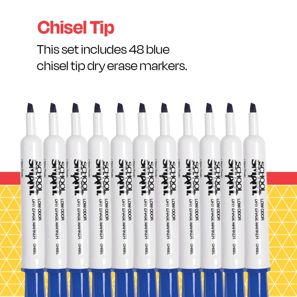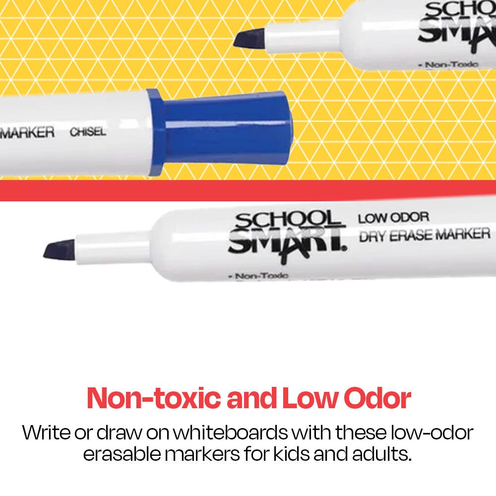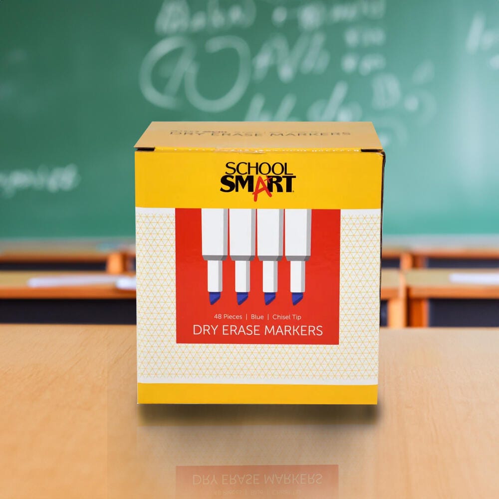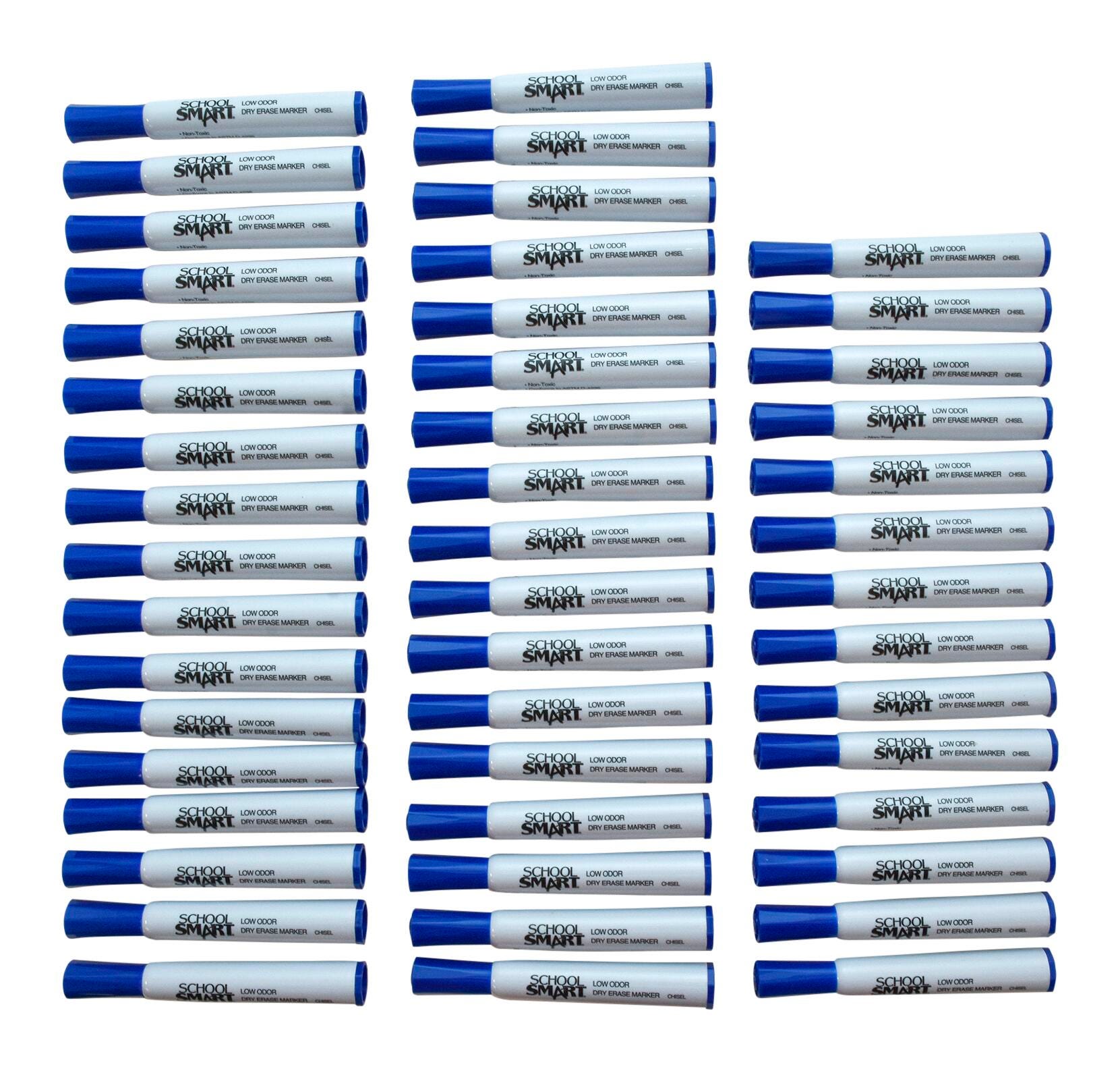 The School Smart blue dry-erase markers bulk pack is great for teachers, students, and office professionals. Use the low-odor dry wipe marker pens for group lessons, problem-solving, daily schedule displays, and more. Convenient chisel tips allow for fine line or broad strokes when needed. Our whiteboard pens are easily erasable while providing smooth ink flow. This blue marker set produces rich, solid, and bright color on whiteboards, glass, and other non-porous surfaces