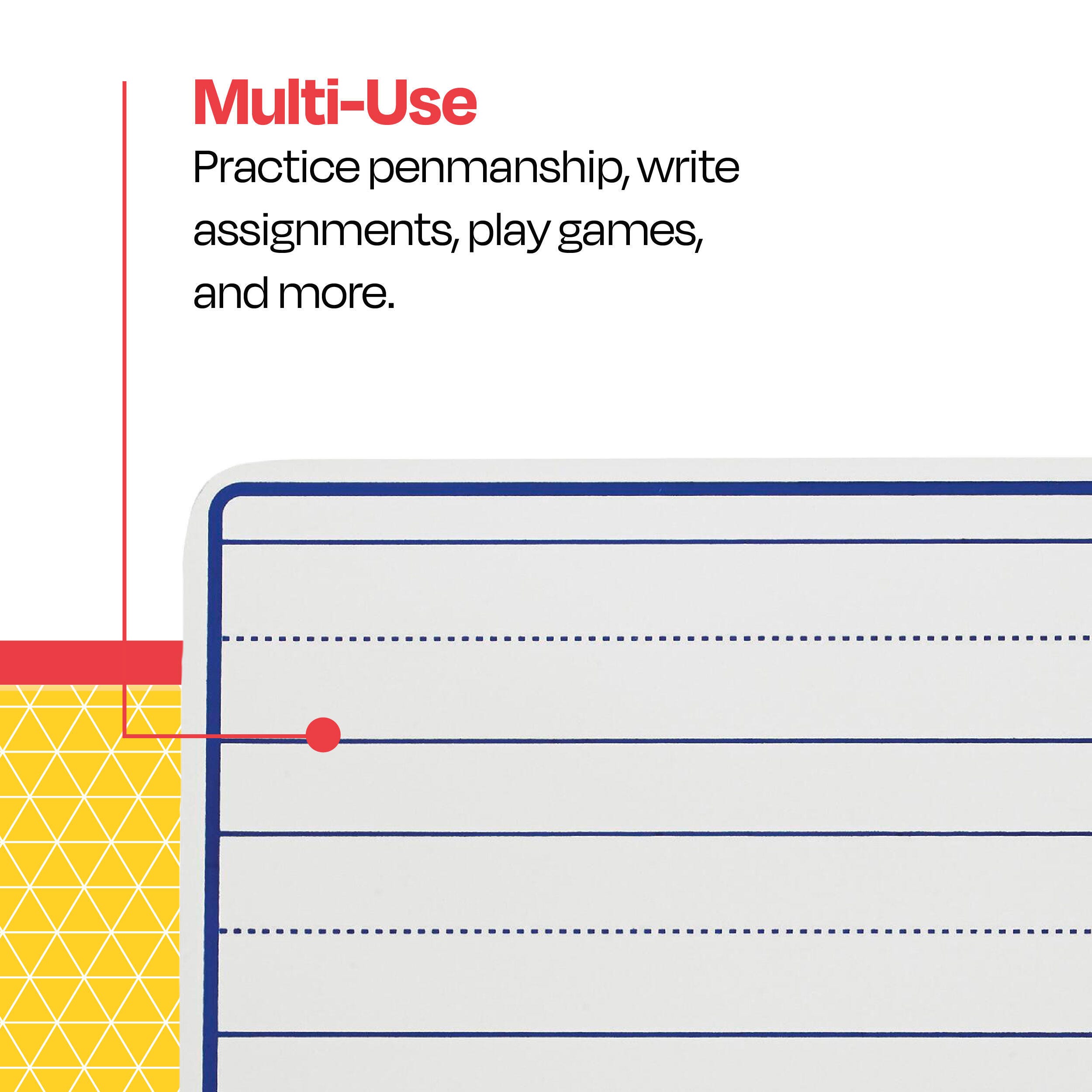 A reusable design with ruled lines helps students practice writing, penmanship, and grammar