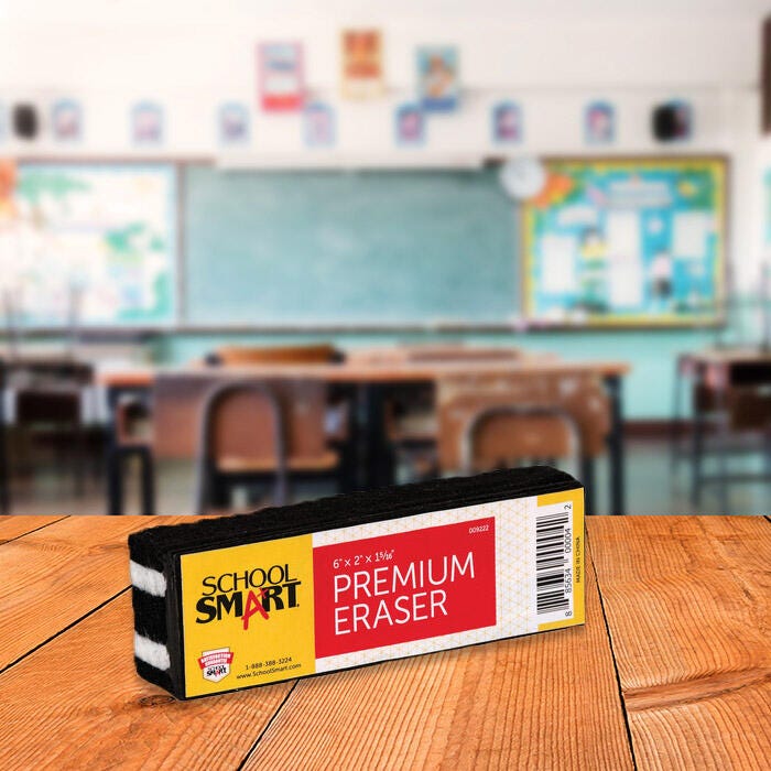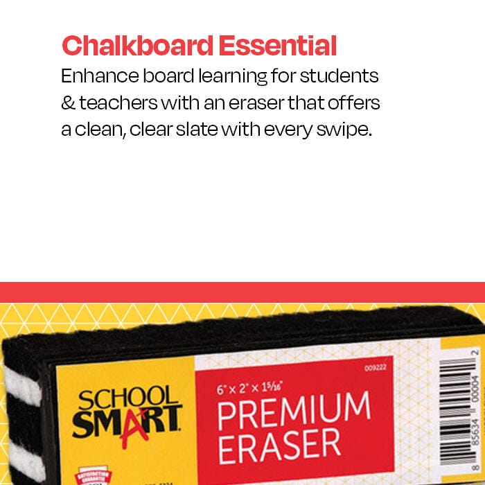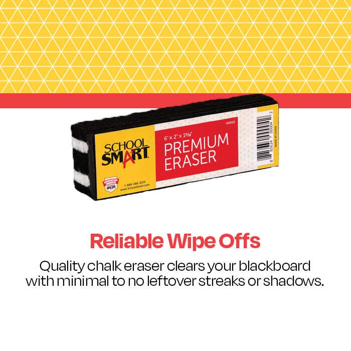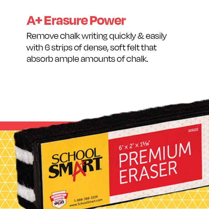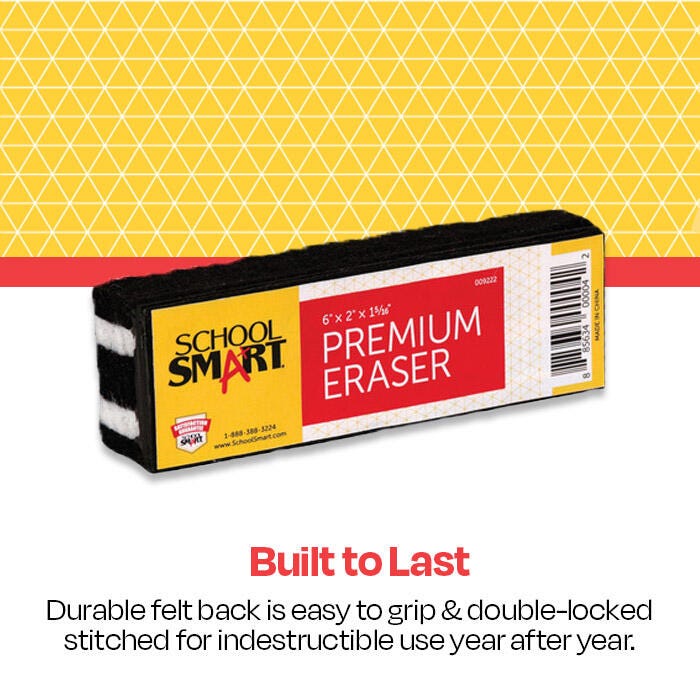The long-lasting School Smart Premium Felt Chalkboard Eraser, measuring 6 x 2 x 1-5/16 inches, takes the stress out of cleaning chalk off of boards. The felt eraser features six strips of quality black and white erasing felt that are dual-sewn with strong nylon thread to a rigid inner felt back. This construction lends itself to quick and efficient eraser power. The felt back is laminated and double lock-stitched creating a full 7/16-inch thick, unbreakable base, built to last. Level up your classroom supplies this season with a premium felt eraser from School Smart!